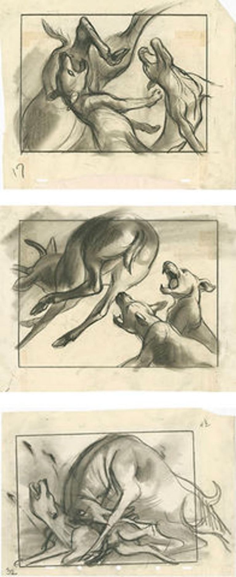 Die außergewöhnliche Qualität einiger ihrer Skizzen, wie z. B. eine, die den berühmten Kampf zwischen einigen Jagdhunden und Bambi zeigt, fiel den legendären Trickfilmern Frank Thomas und Ollie Johnston auf. "Wir waren verblüfft, als wir Retta Scotts erstaunliche Skizzen der bösartigen Hunde sahen...", heißt es auf der Website des Walt Disney Family Museum.