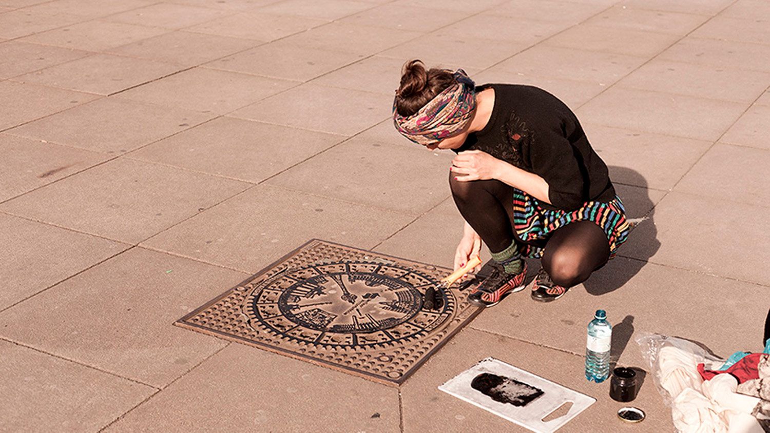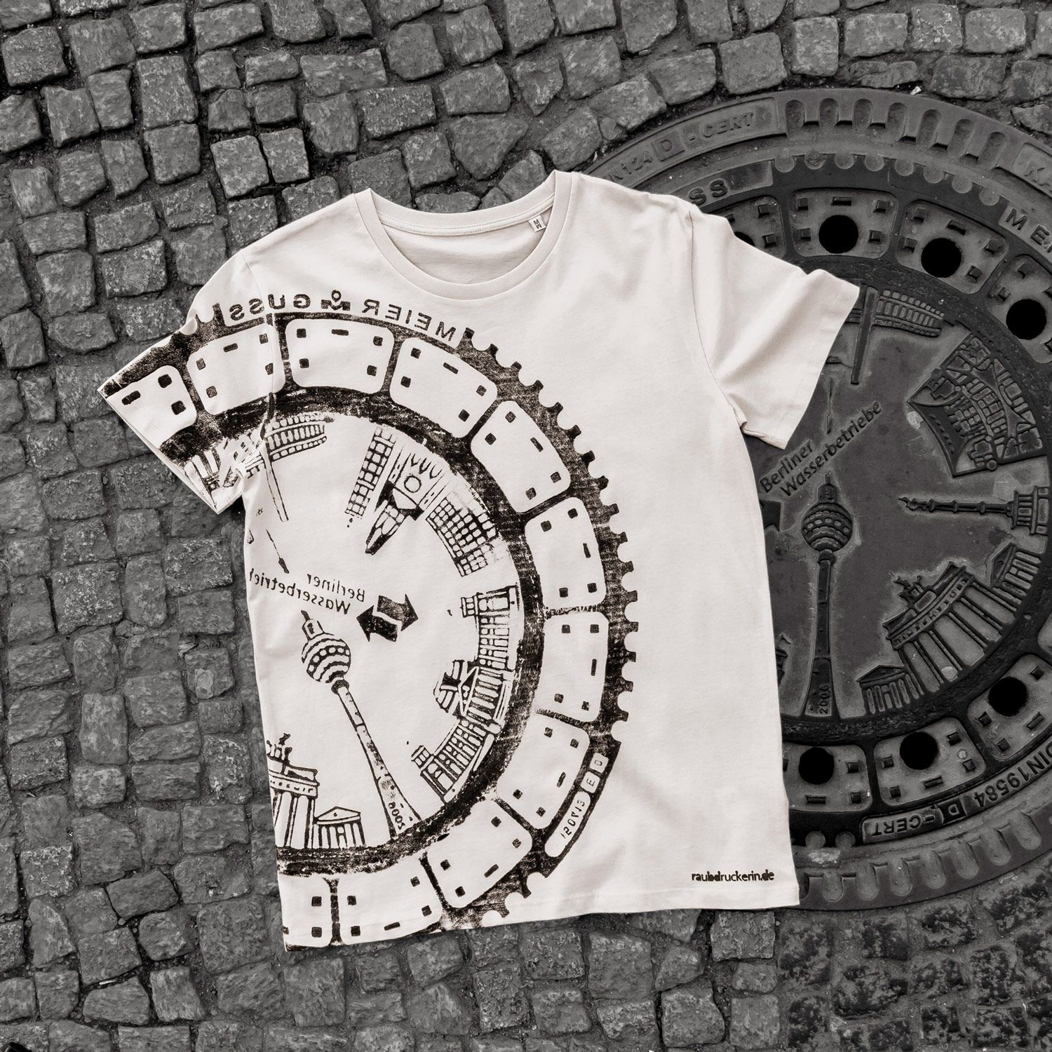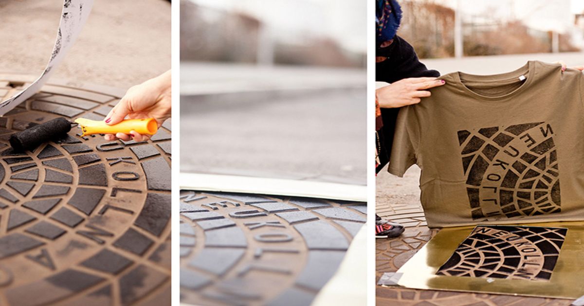 Die Vorgehensweise ist einfach. Sie identifizieren einfach eine erhabene Fläche mit einem Motiv, das sie gerne auf einem T-Shirt, einer Tasche oder einfach an der Wand aufgehängt sehen würden. Man könnte es eine nomadische, mobile Werkstatt nennen. Bei Raubdruckerin arbeiten sie auf der Straße, imprägnieren die Oberfläche selbst mit Tinte und fertigen jedes Kleidungsstück von Hand an, abhängig von den Witterungsbedingungen, so dass der gesamte Prozess sehr nah am endgültigen Empfänger ihrer Kleidungsstücke und gedruckten Objekte stattfindet.
