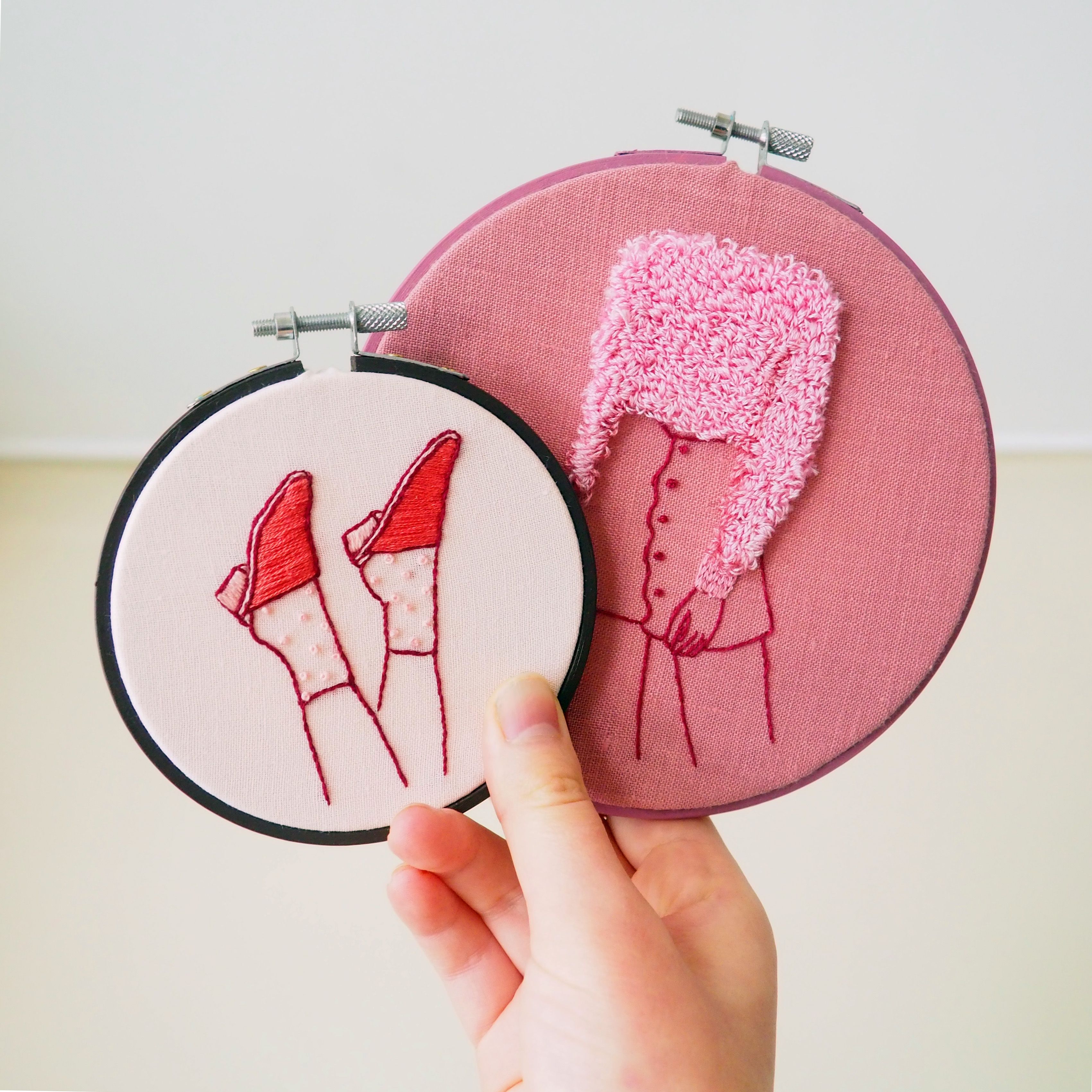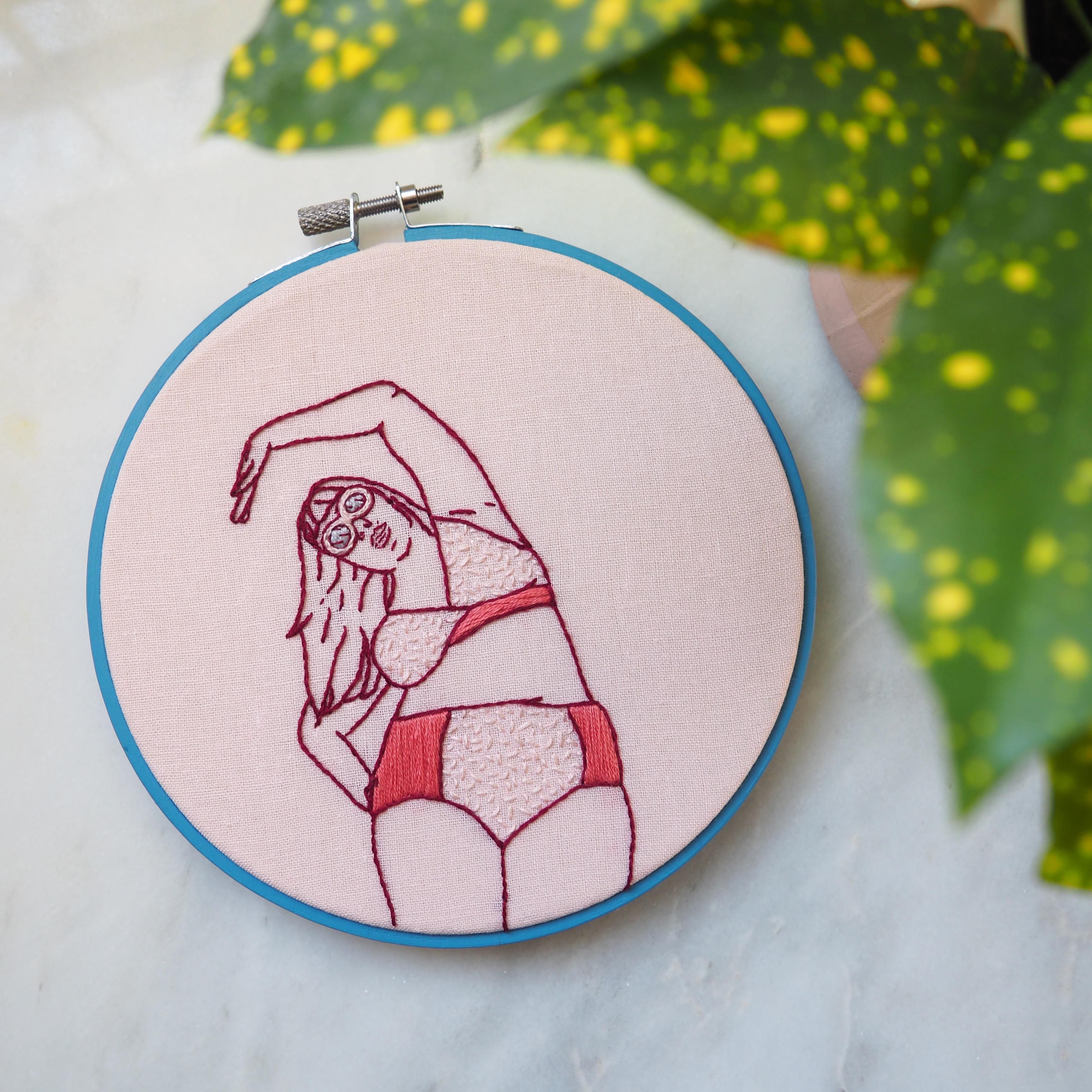 Courtney McLeod, auch bekannt als Dearest Q (@dearest_q), ist eine Textilkünstlerin aus Philadelphia, die farbenfrohe, gerahmte Stickereikunst schafft, die von Modeillustrationen und der Popkultur der 90er Jahre inspiriert ist. Courtney arbeitet mit klaren Linien und minimalistischen Kompositionen und fertigt figurative Illustrationen auf Stoff. Sie verkauft ihre Arbeiten in ihrem Online-Shop und hat Aufträge von Brie Larson, Peppa Pig und den Zeitschriften "Today's Parent", "Love Embroidery" und "Koel" erhalten.