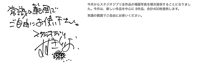 Im September veröffentlichte der Produzent des Studios, Toshio Suzuki, eine handschriftliche Notiz, in der er die kostenlose Freigabe von Bildern von acht seiner Filme ankündigte. In den folgenden Monaten wuchs die Zahl der Bilder, und seit Anfang Dezember steht die vorerst letzte Sammlung zum kostenlosen Download bereit.
