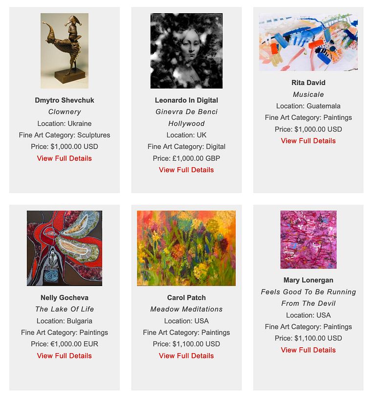 Eine der berühmtesten virtuellen Kunstgalerien und von großem Prestige begleitet. Du findest hier ein Publikum, das sich speziell für den Erwerb von Kunst interessiert. Die Preisspanne der Werke reicht von 500 bis zu mehr als 10.000 USD, mit Künstlern aus praktisch der ganzen Welt.