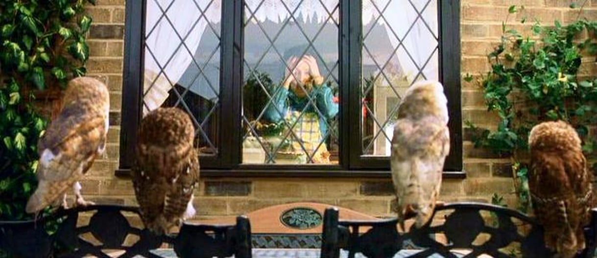 Während der Dreharbeiten schauten die Eulen jedoch ständig in die Kamera hinter ihnen. Um die Eulen abzulenken, beschloss ein findiger Assistent, eine tote Maus an Tante Petunias Schürze zu befestigen. Denn egal, wie fesselnd Tante Petunias Auftritt auch war, nichts fesselt eine Eule so sehr wie eine tote Maus.