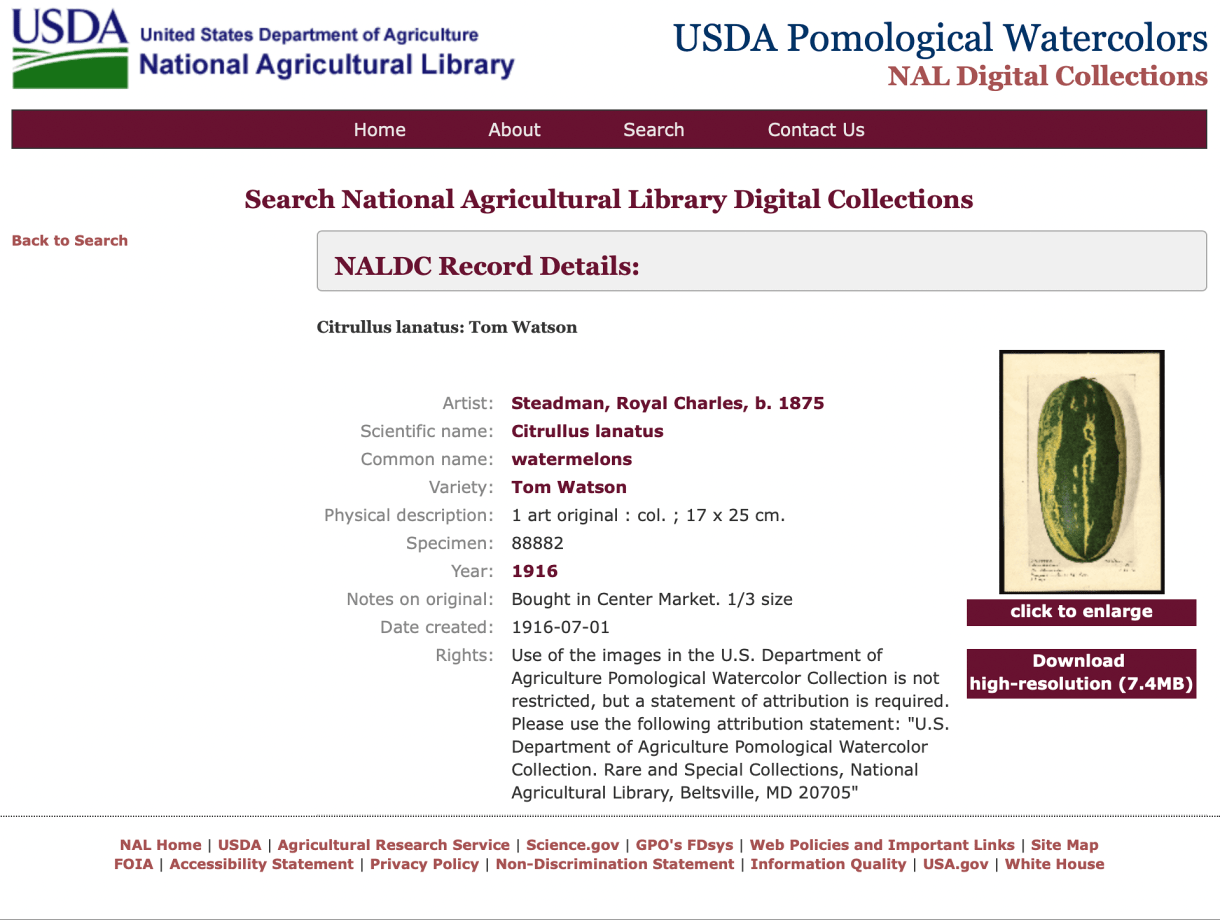 Der Suchbereich der Sammlung ermöglicht es dir, das Archiv eingehend zu erkunden. Du brauchst nur den Namen der gesuchten Frucht, des Gemüses oder der Pflanze eingeben (auf englisch) oder jede Seite zu besuchen, bis du ein interessantes Bild findest. Du kannst die meisten Bilder in hoher Auflösung herunterladen. Die Aquarelle werden mit einem Informationsblatt geliefert, das den Künstler, das Jahr und den wissenschaftlichen oder gebräuchlichen Namen der Frucht, der Pflanze oder des Gemüses enthält.