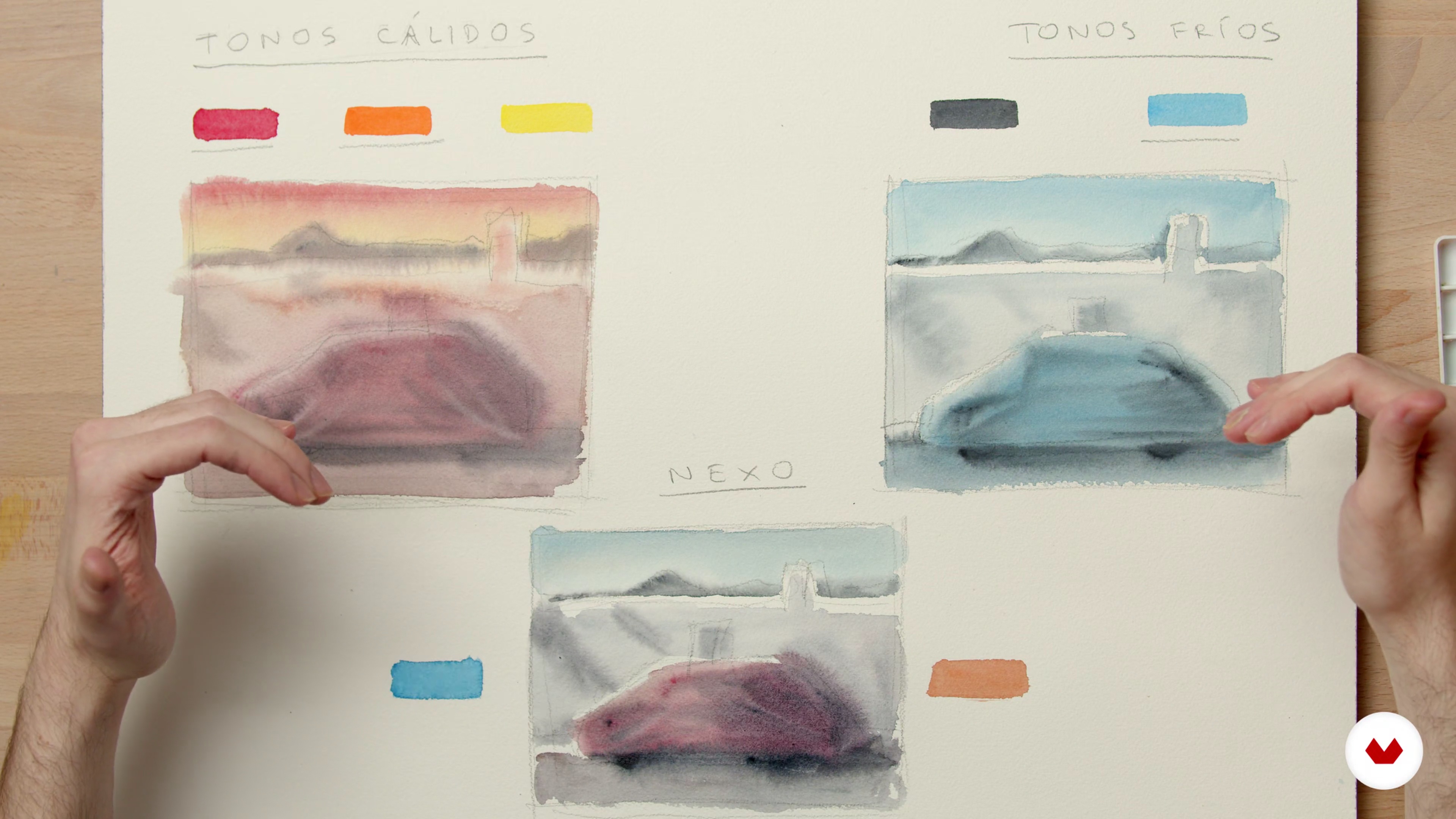 “DIE WICHTIGKEIT DER FARBE Jetzt werde ich die gleiche Zeichnung machen, aber mit kalten Tönen. Genau wie bei den warmen werde ich eine sehr schematische Zeichnung machen und das Verfahren wird das gleiche sein. In dieser Zeichnung war ich daran interessiert, die Mischungen zu sehen weil ich Paynes Grau verwenden musste und legen Sie es auf diese Seite der Palette, um mehr Farbintensität zu erhalten. aber jetzt werde ich nur die rechte seite benutzen und ich werde Paynes Grau und Winsor Blau verwenden. Wie Sie vielleicht gesehen haben, habe ich das Papier anders angefeuchtet. Ich habe auf de...”