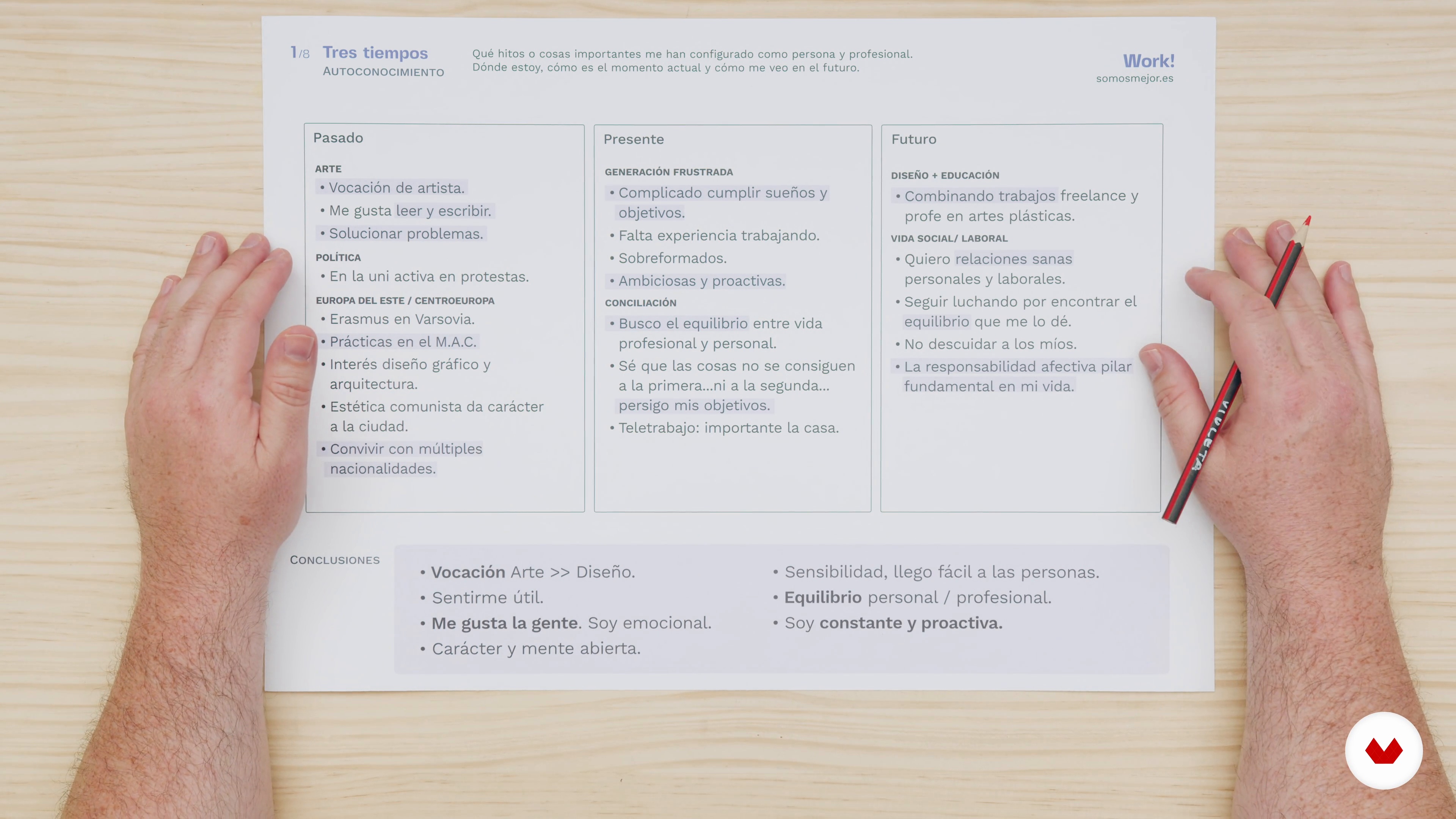 “Drei Zeitformen: Vergangenheit, Gegenwart und Zukunft Wir erklären das erste Werkzeug der Methodik. Es heißt Dreimal. Es ist in Vergangenheit, Gegenwart und Zukunft unterteilt. Eines müssen Sie verstehen, bevor Sie sich an die Arbeit machen ist, dass dieses Tool kein Lebenslauf ist. Dieses Tool konzentriert sich auf die qualitative, nicht quantitativ. Es geht darum, die relevantesten Wendepunkte zu finden die in deinem Leben passiert sind. Das können Bücher, Reisen, Erlebnisse, alles was dich emotional berührt, inspiriert hat, Es schwirrt in deinem Kopf herum und du weißt nicht warum. Denke...”