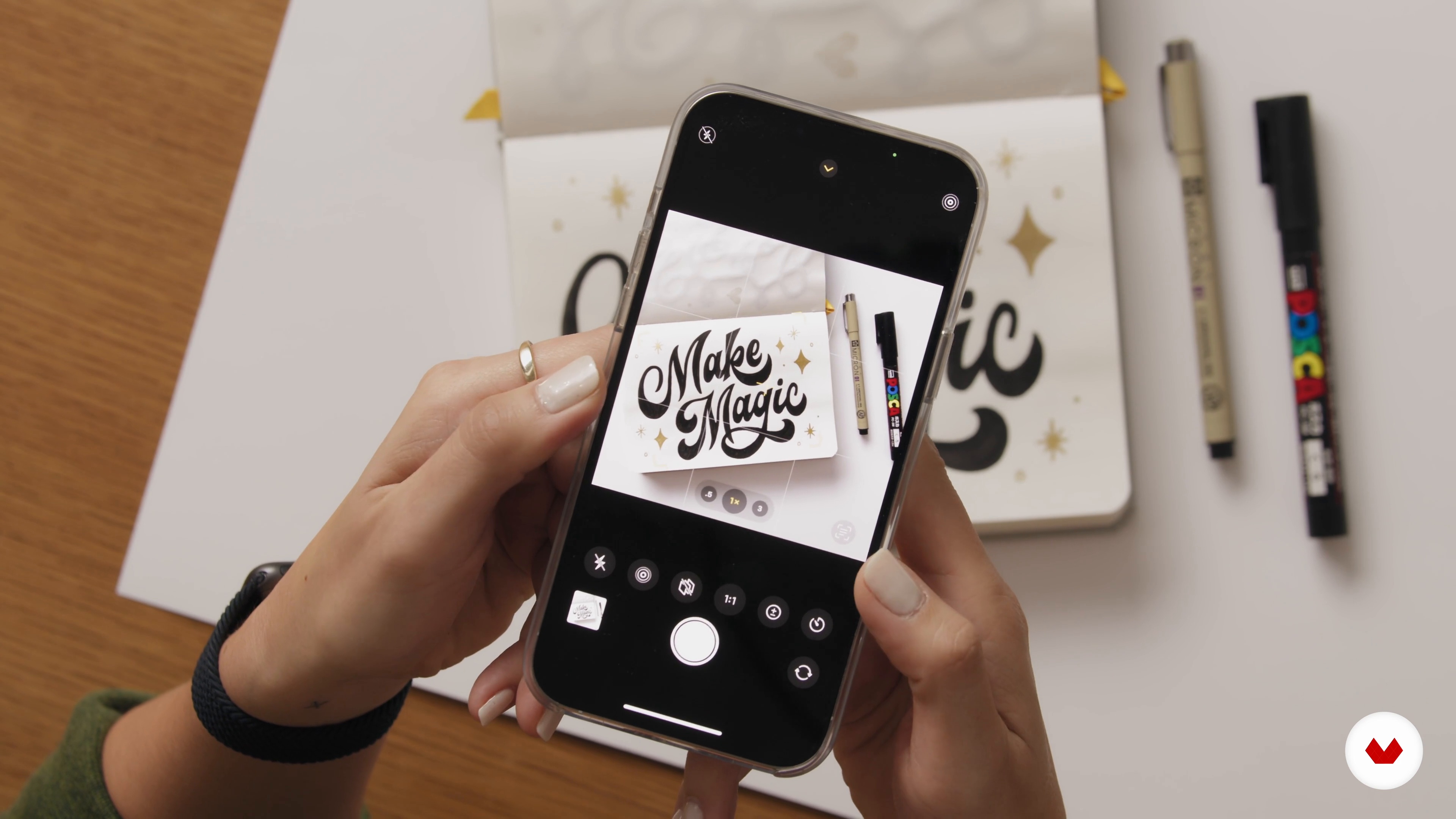 “Arbeit teilen, um Arbeit zu bekommen In dieser Lektion zeige ich Ihnen, wie ich meine Arbeit in sozialen Medien teile. Zuerst öffne ich meine Kamera im Fotomodus. Hier habe ich meine Skizze angelegt. Ich habe die Stifte, mit denen ich die Skizze erstellt habe, was ihm ein bisschen Kontext gibt. Ich habe ein weißes Blatt Papier, um ihm einen schönen neutralen Hintergrund zu geben damit mein Schriftzug auffällt. Ich werde mein Telefon über meiner Skizze positionieren, und ändern Sie das Verhältnis so, dass es ein quadratisches Foto ist. Ich werde dafür sorgen, dass mein Schriftzug das Highlig...”