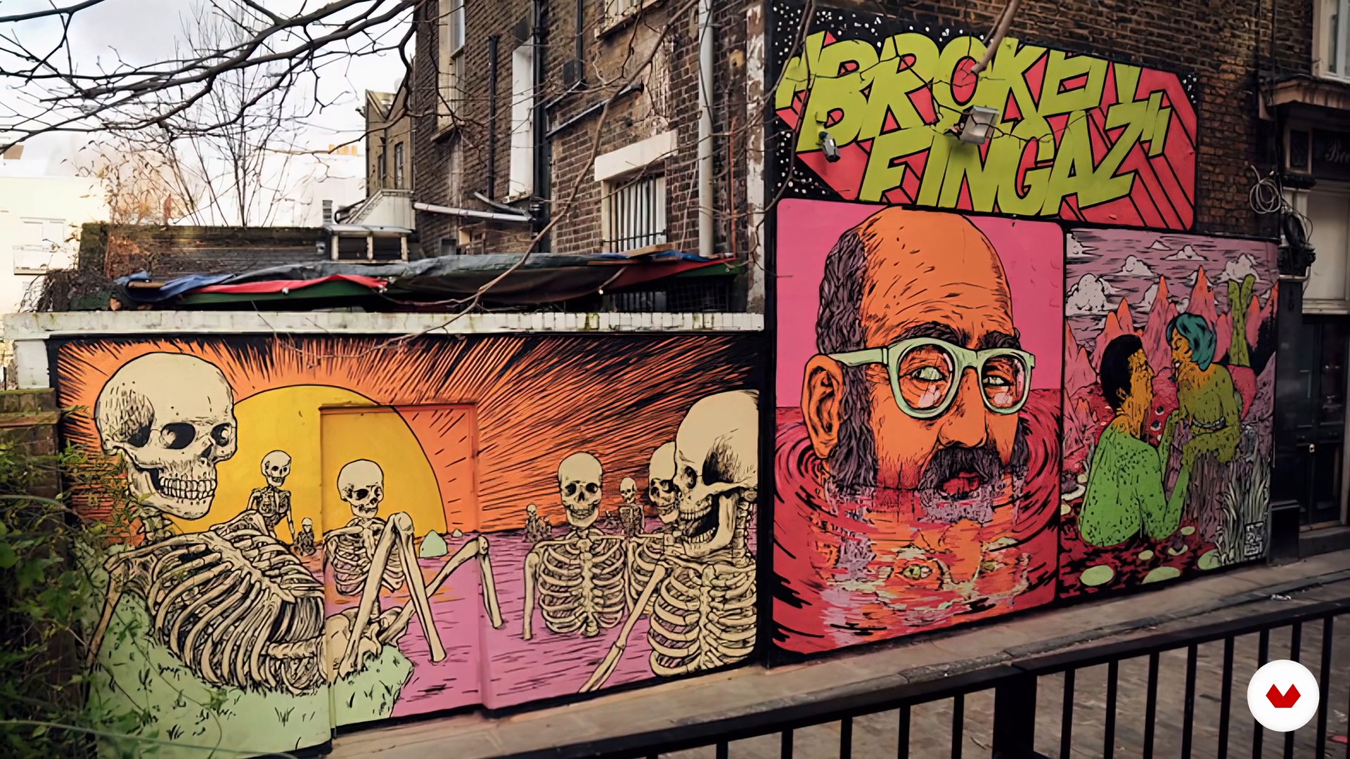 “In diesem Kurs werde ich ein wenig über meine wichtigsten Einflüsse in der Kunst sprechen. Dies sind einige meiner Filme, Lieder, Lieblingsspiele und Künstler. Ich beginne mit dem multikulturellen Kollektiv Broken Fingers. Ihr einzigartiger und surrealer Stil fesselte meine Aufmerksamkeit vom ersten Tag an, als ich mit ihnen in Kontakt kam. Die unregelmäßigen und thematischen Linien waren eine große Inspiration auf meiner Reise. Ich möchte dieses Wandgemälde hervorheben, Das war eines der ersten Werke, mit denen ich Kontakt zum Kollektiv hatte. Die Totenköpfe sonnen sich, Die geschmolzene H...”