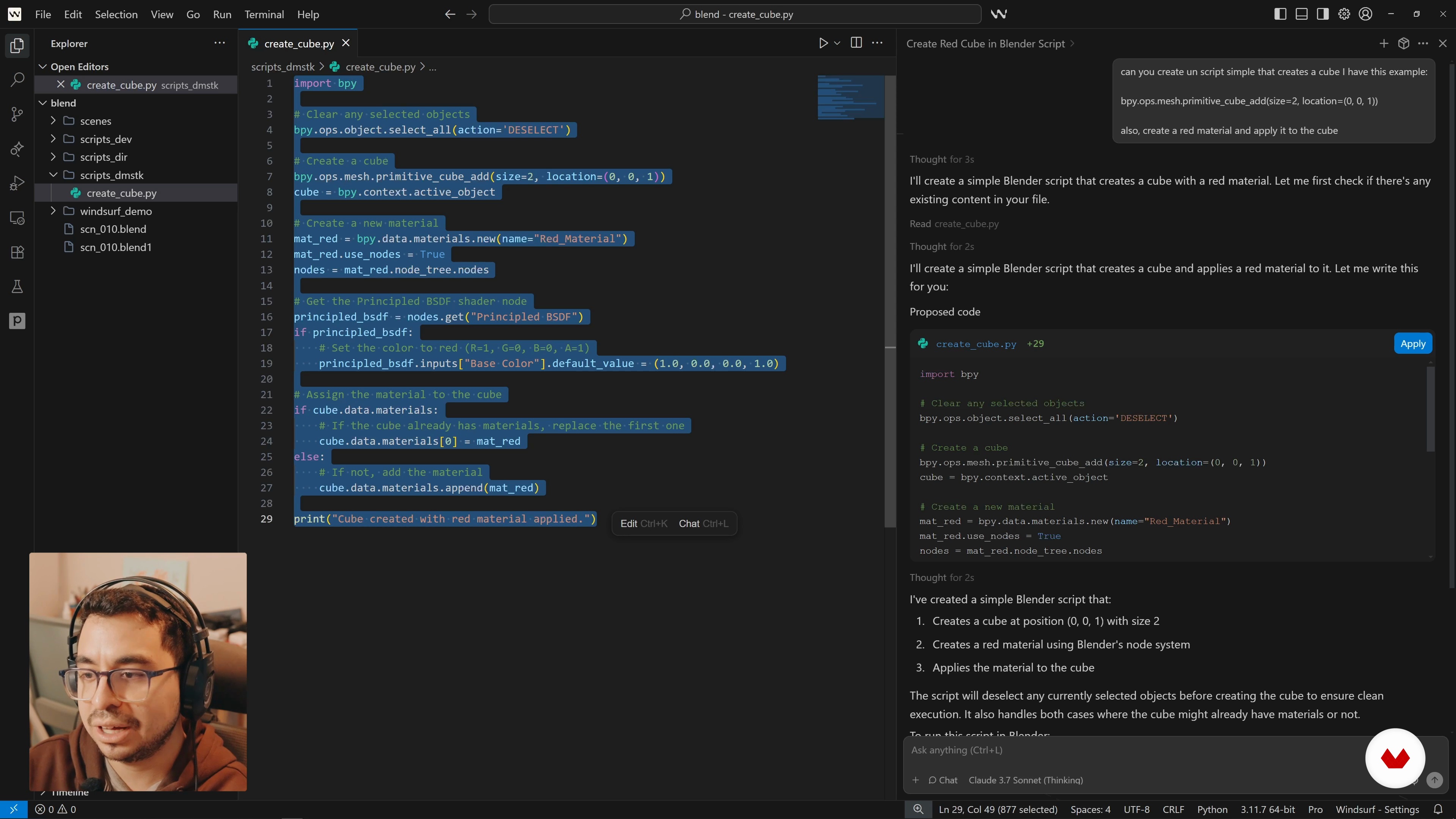 “Sie lernen die Grundlagen von Python, den Einsatz künstlicher Intelligenz zur Codegenerierung ( ) und die Integration mit Windsurf kennen. Sie sehen Beispiele, die in Blender implementiert sind und Sie zur Erstellung benutzerdefinierter Tools und zur Optimierung Ihres Workflows inspirieren.”