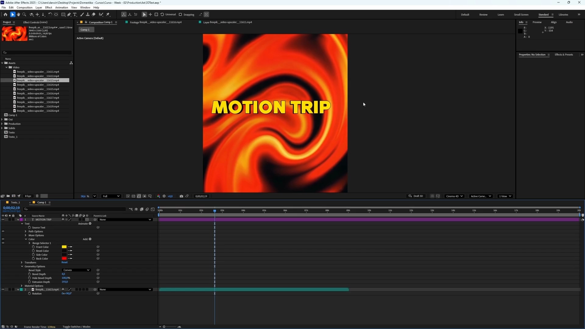 “Mit derselben Technik generieren Sie 3D-Textvariationen und erstellen Masken, Rotationen und Duplikate, die Ihren Kompositionen Dynamik verleihen. Sie passen Ansichten und Kamera an, um das Ergebnis zu perfektionieren, und können die Animation wiederverwenden, indem Sie nur den Textinhalt ändern. Schließlich exportieren Sie Ihr Video im H.264-Format und können es in Ihren Projekten verwenden.”