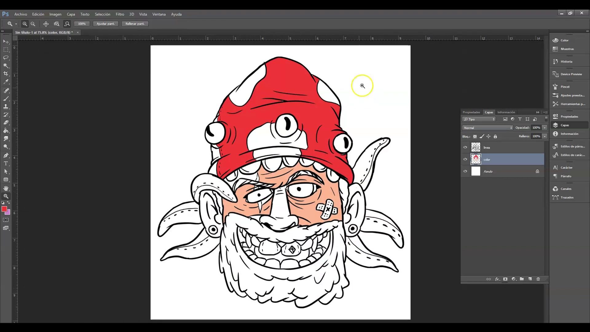 “Jetzt sehen wir ein etwas einfacheres Beispiel: weil das Plakat, das wir sehen, etwas komplizierter ist. Also wollte ich dir zeigen, wie ich färbe für eine etwas einfachere Darstellung. Es ist nicht mehr so kompliziert wie das Poster, dann auch nicht, damit es kein Vorwand ist dass die Techniken, die wir im Poster gesehen haben Sie können nicht für einfachere Objekte erstellt werden. Also muss ich als erstes tun, Ich muss eine weitere Ebene erstellen. Zum Erstellen gehe ich hier nach unten und ich habe dieses kleine Quadrat getroffen und es erzeugt eine neue Ebene. Farbe. Also hier, in dies...”