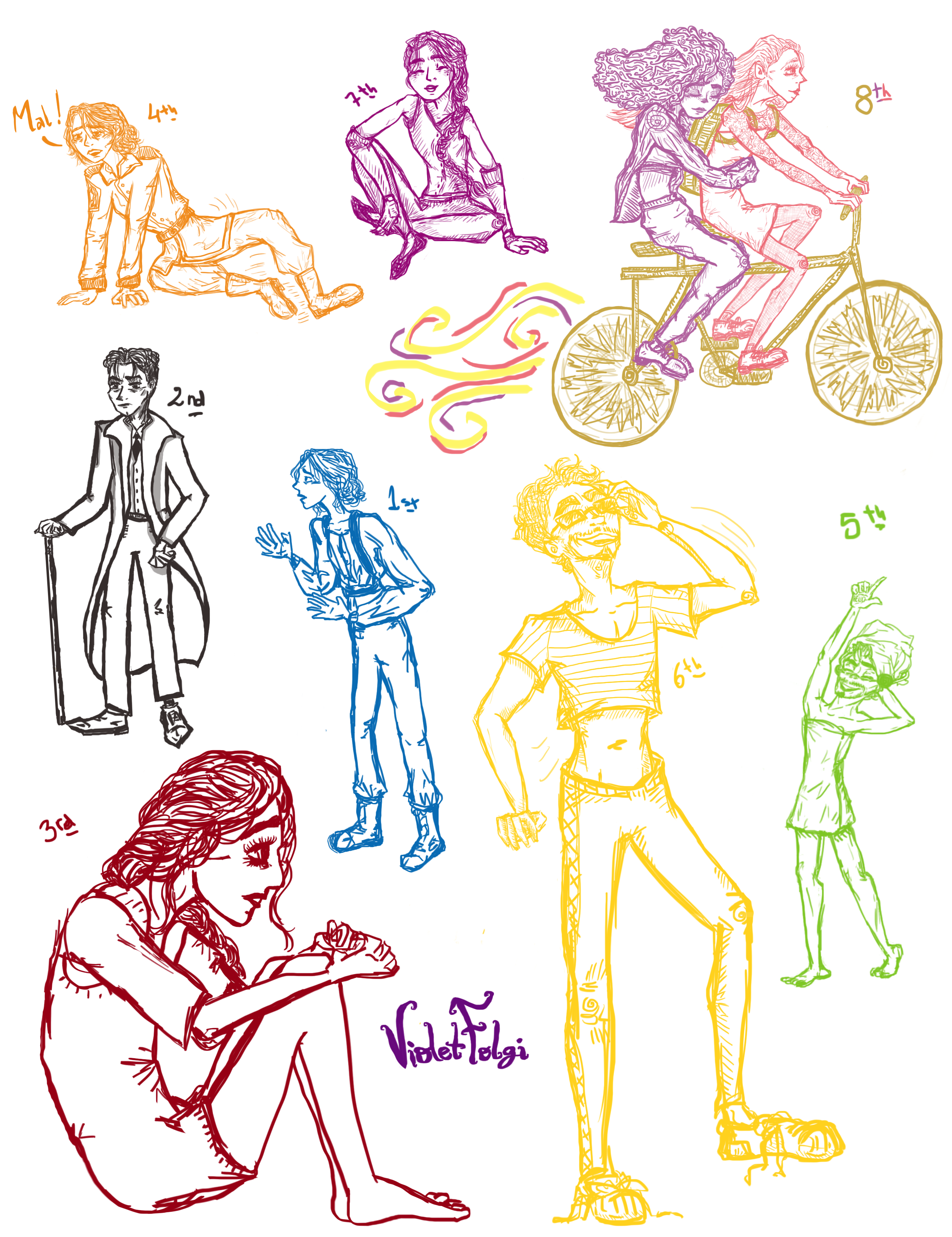 Siguiendo la numeración en el dibujo finalizado, los personajes que dibujé son: Alina Starkov (azúl), Kaz Brekker (negro), Inej Ghafa (rojo), Alina Starkov de la serie Shadow and Bone (naranja), Klaus Hargreeves de The Umbrella Academy (verde), Klaus Hargreeves de vuelta (amarillo), Inej Ghafa de vuelta pero feliz jaja (violeta), y por último, Rue y Jules de Euphoria en una bicicleta (lila, rosa y amarillo). Conocen a alguno de estos personajes? Espero les haya gustado :) si son fans de estos personajes o les gustó mi arte, pueden encontrarme en instagram aquí: @violetfolgi_art