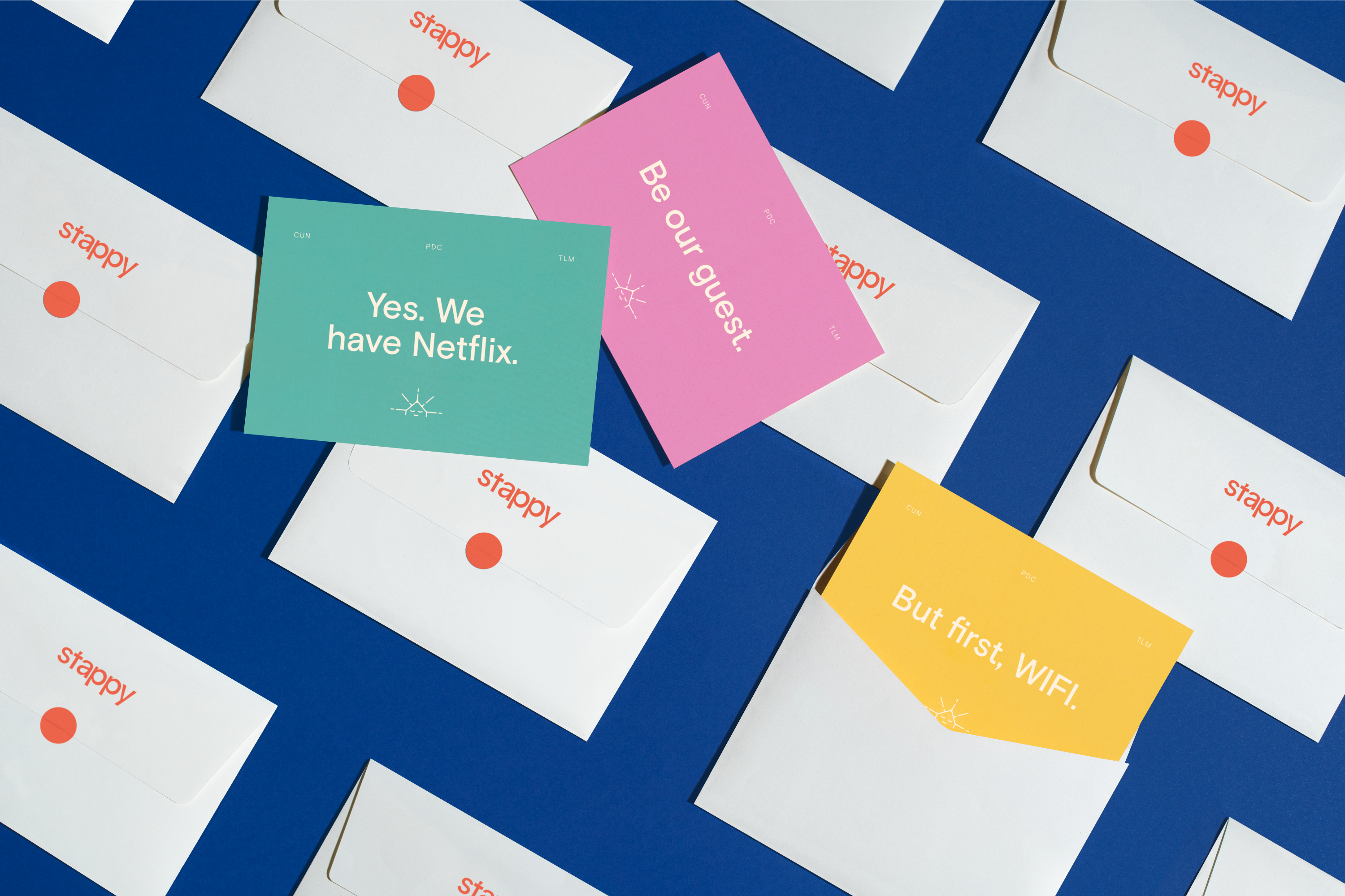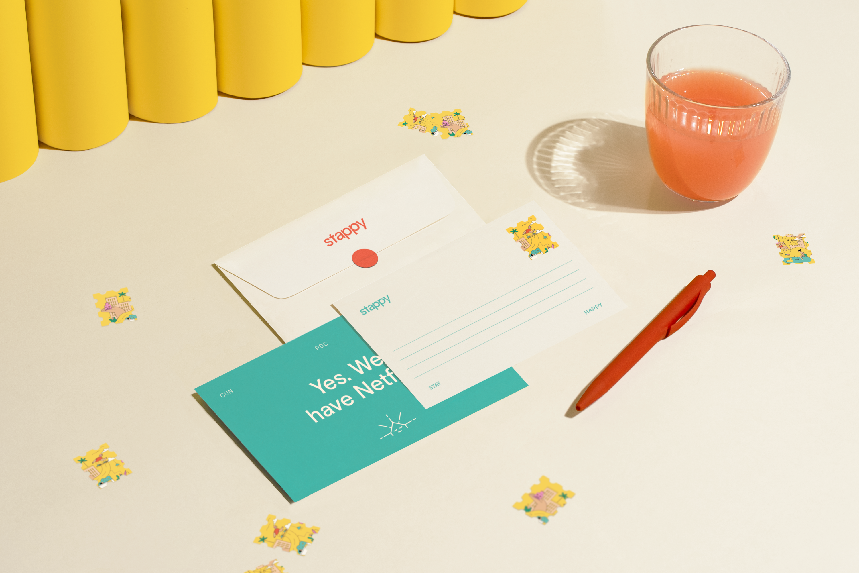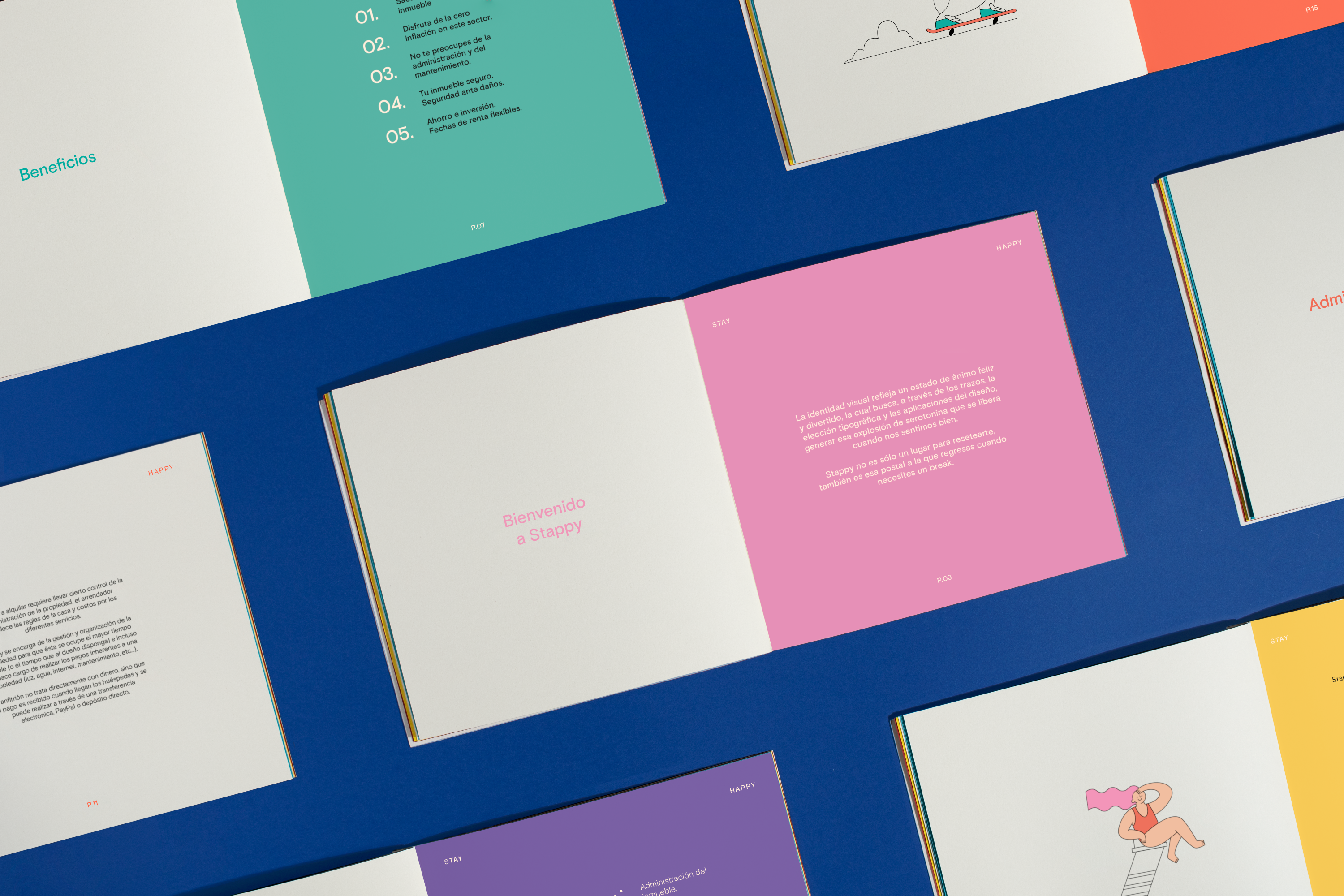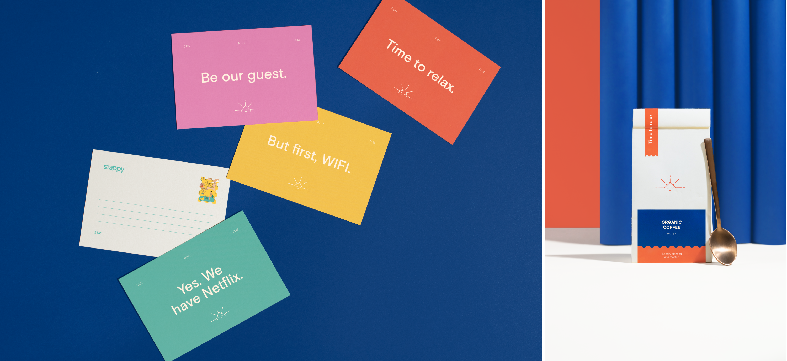 Stappy nace de la idea de mantenernos felices el mayor tiempo posible, por eso el nombre surge de stay happy. Este estado de ánimo se refleja en la identidad gráfica, la cual busca, a través de los trazos, la elección tipográfica y las aplicaciones del diseño, generar esa explosión de serotonina que se libera cuando nos sentimos bien. Los colores refuerzan el carácter relajado de los días de descanso, pero también la energía que nos dan. Las ilustraciones se complementan entre sí como las fotografías mentales que no queremos olvidar, pero que no hace falta tomar. Stappy no es sólo un lugar para resetearte, también es esa postal a la que regresas cuando necesites un break.