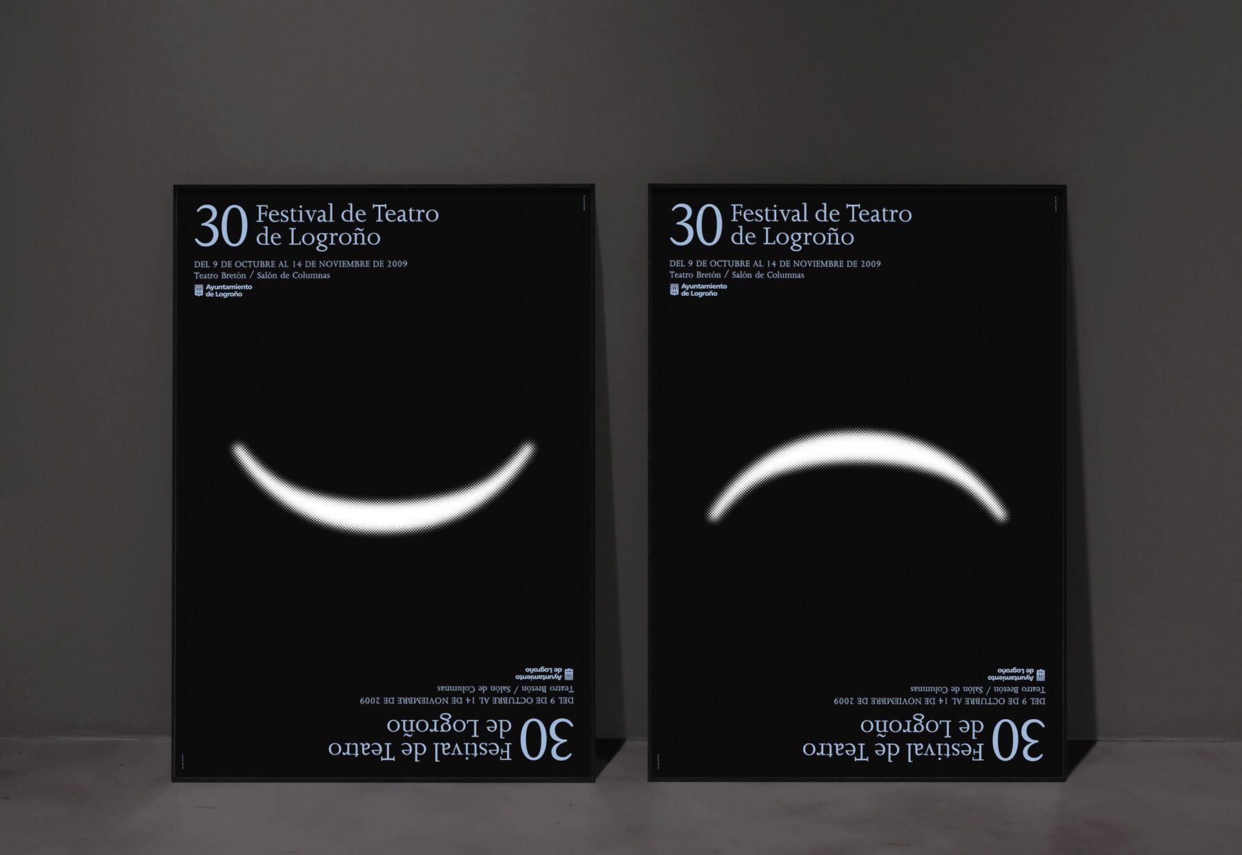 El cartel del “Festival de Teatro de Logroño” tiene la particularidad de ser dos carteles en uno. Basado en las tradicionales máscaras teatrales de drama y comedia, basta con girarlo para que la sonrisa se vuelva tristeza. Cliente: Ayuntamiento de Logroño.