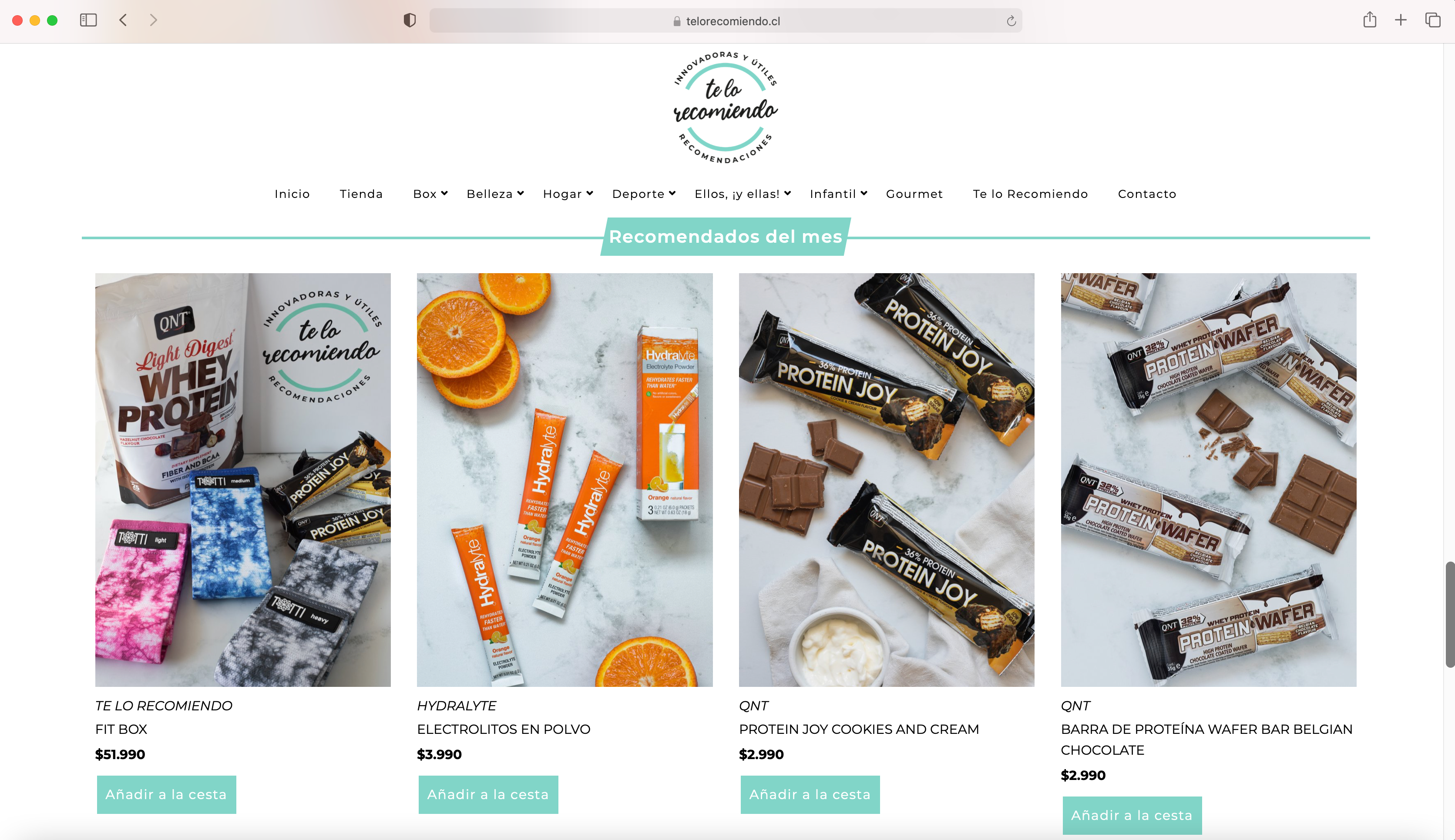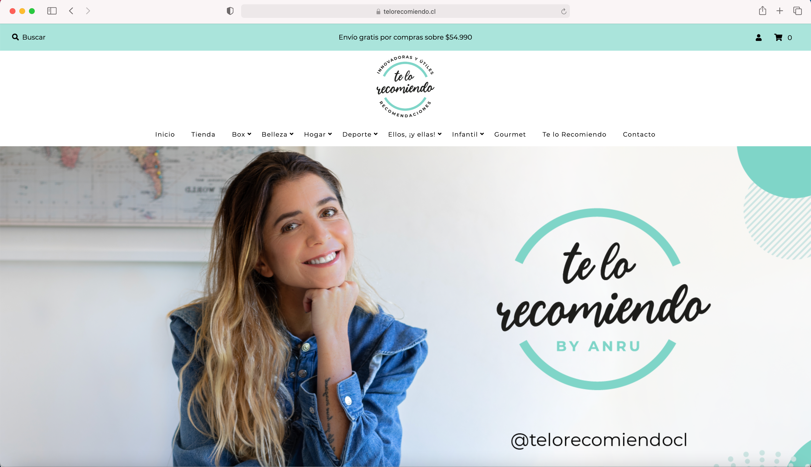 Diseño y desarrollo de tienda online para cliente TeloRecomiendo, trabajo realizado en Shopify con incorporación de gestión de boletas automáticas, gestión de envios, y llamados de pocas existencias para gatillar la compra de los clientes.