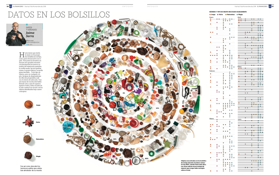 Hacía meses que metía la mano en los pequeños bolsillos de mi hijo como quien desenvuelve un regalo. Tras poner la lavadora en marcha, me quedaba mirando con fascinación los tesoros extraídos del minúsculo pantalón: la cerilla usada, las tres piedras romas, la goma elástica, la media pinza mordida... Todo tipo de objetos, pero no cualquier objeto. Incapaz de desprenderme de ellos, me preguntaba cuál era el criterio de selección. Tras seis meses de recolección había llenado cinco cajas de zapatos. Aparté el sofá y sobre el suelo de la sala construí círculos concéntricos con los objetos distribuidos bajo cuatro conceptos: juego, dulce, naturaleza, magia.