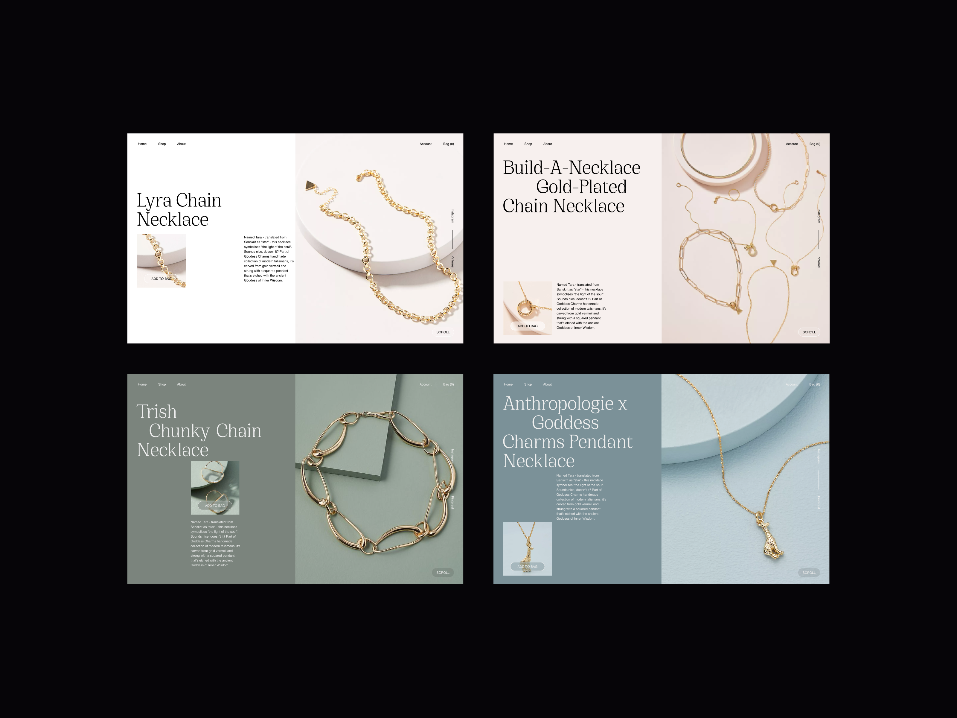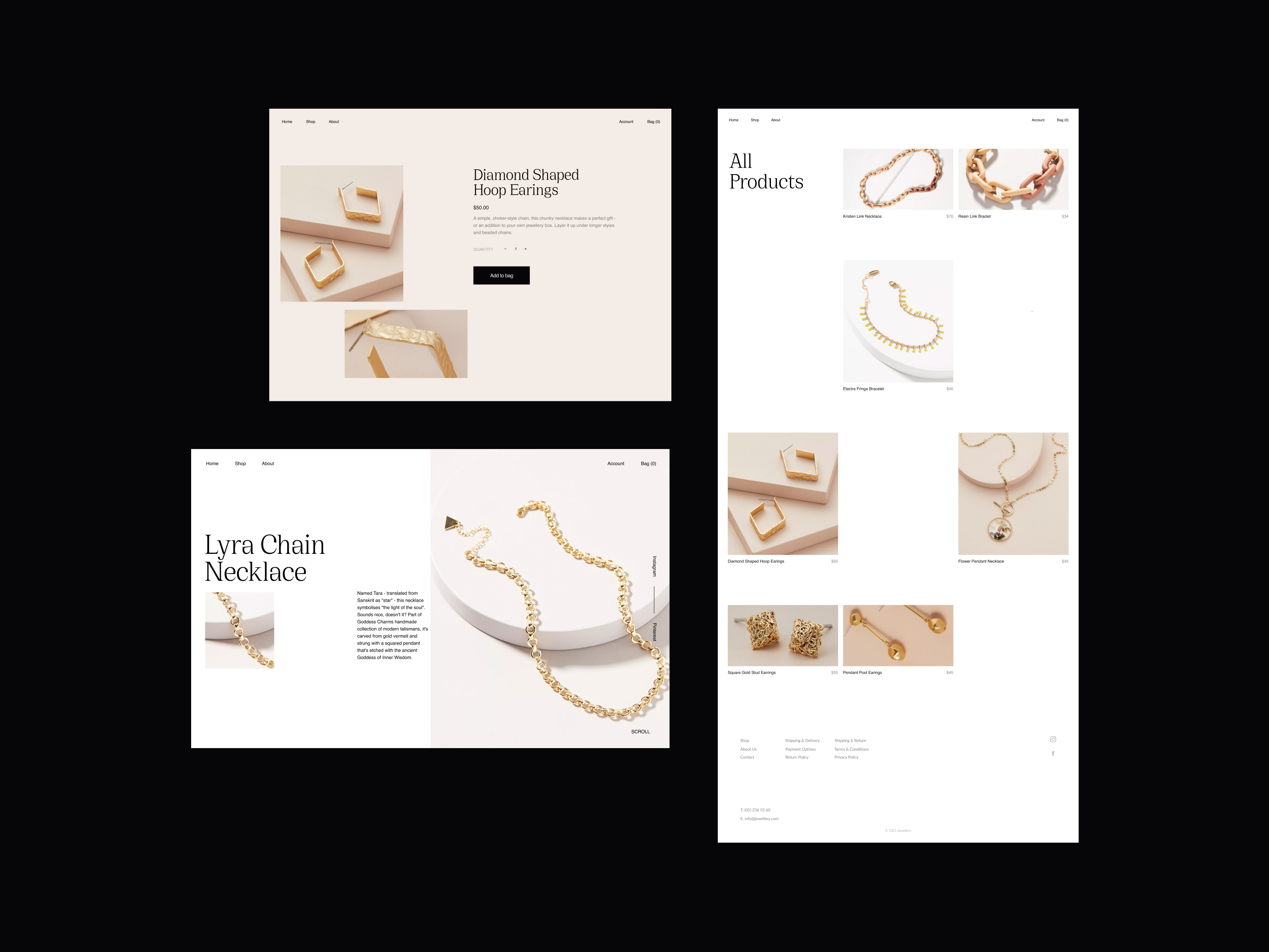 Creating a simple version of the e-commerce site with the homepage, product pages. I tried to achieve a minimal, modern, luxury feeling where every sued can be easy to catch and be impressed by the elegance and simplicity of the website., Following the same style and colors through different screens, branding and cohesion are achieved. All that combined with nice and clean photography.