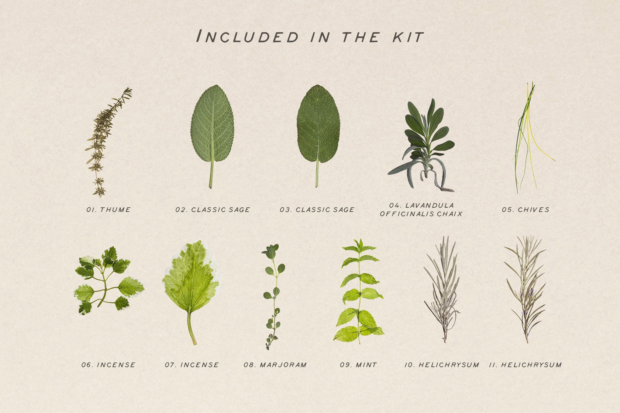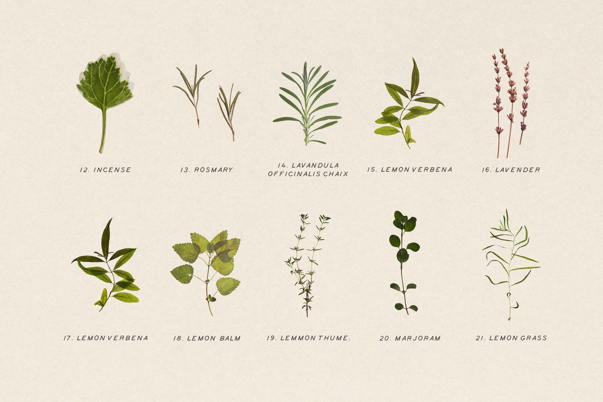 This a collection of pressed and dried herbs. With great patience, we were able to photograph and cut out every little leaves. This collection contains exclusively a collection of aromatic herbs.