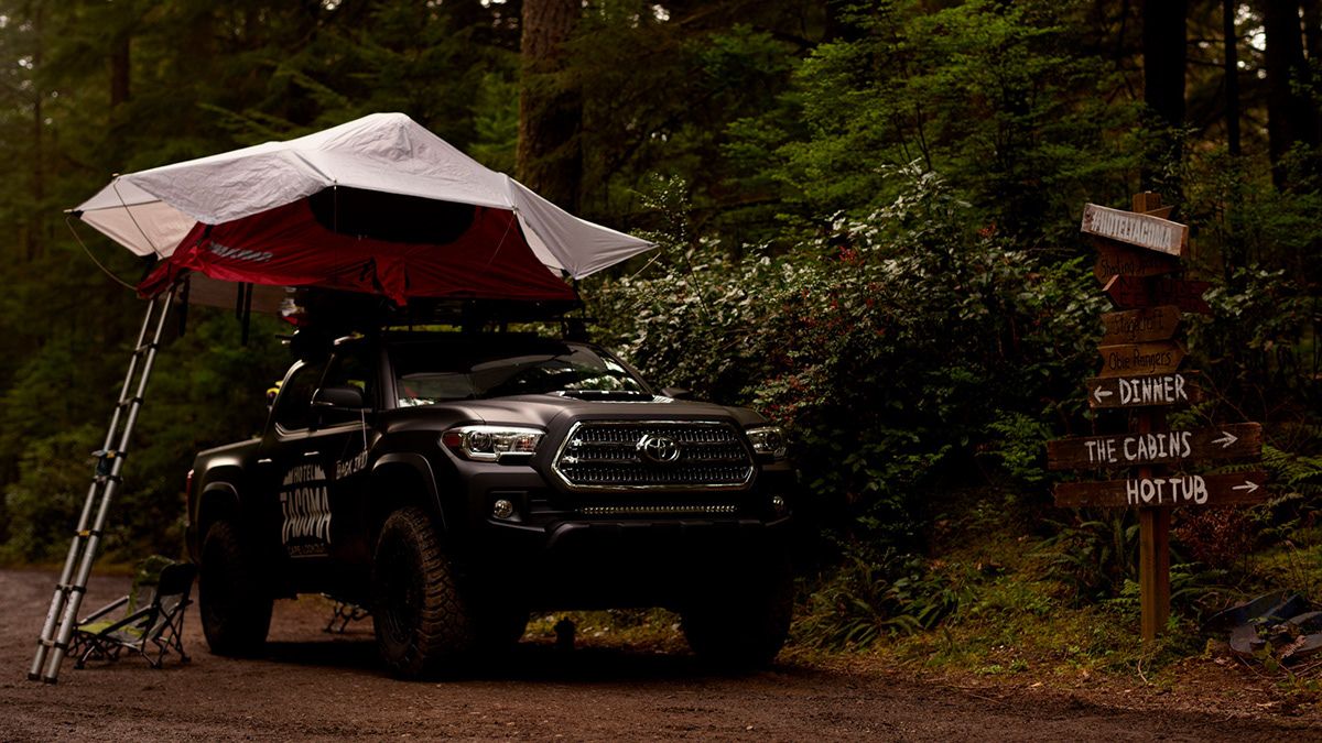 Event-Identitätsdesign für Toyotas Offroad-Influencer-Kampagne in Cape Lookout, Oregon. Tacoma-Fahrer (und Draufgänger im Allgemeinen) wurden für ein Wochenende auf einen Pop-up-Hotel-Campingplatz gebracht, um sich auszutoben und den Prozess zu dokumentieren.