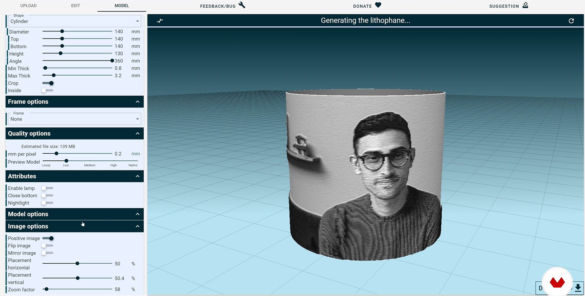 Por último, un tipo de personalización extrema para este tipo de producto es con las litofanías impresas en 3D. Esto lo diseñé fuera de Autodesk Fusion 360, y me permite ofrecer un producto completamente personalizado con una foto del cliente.
