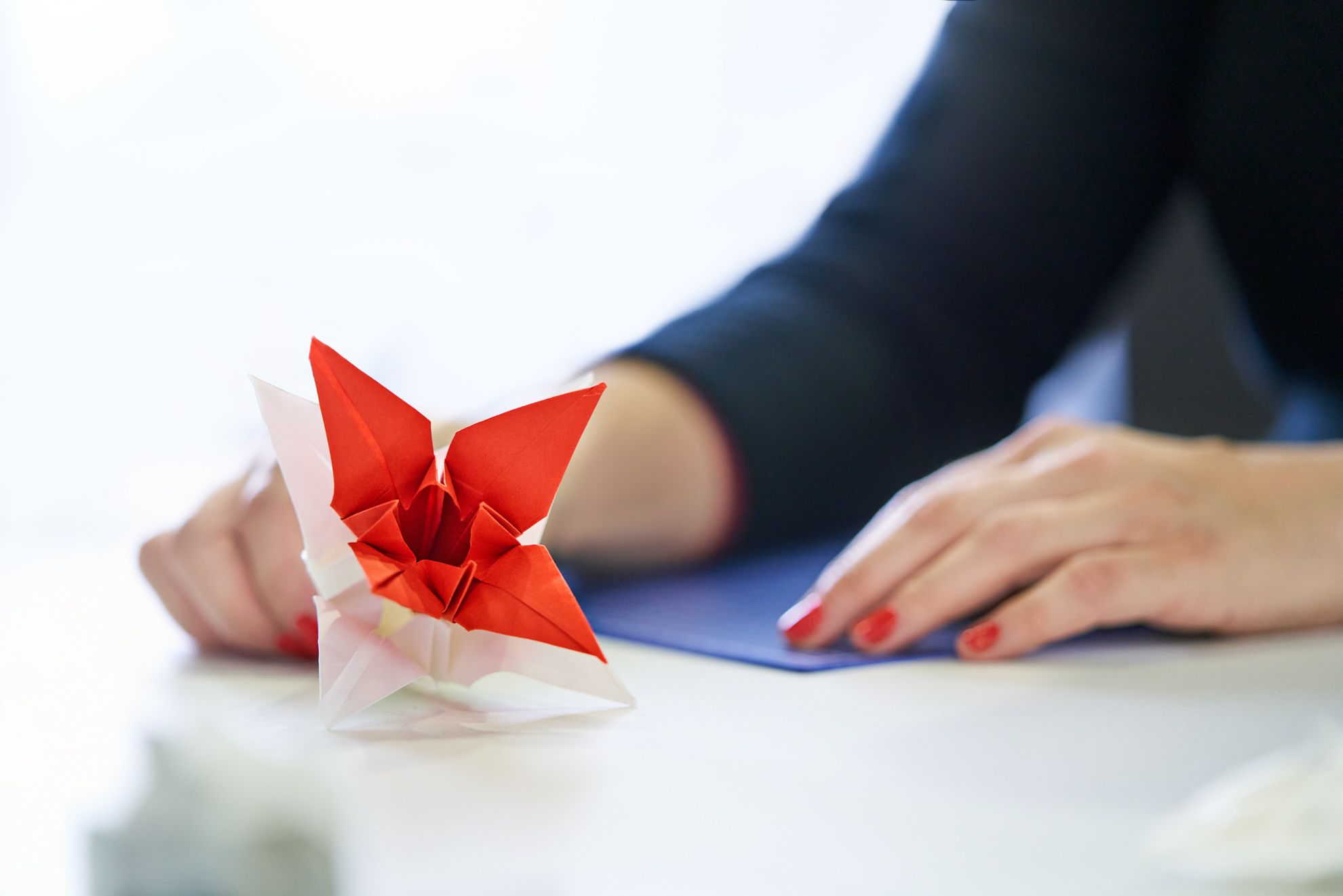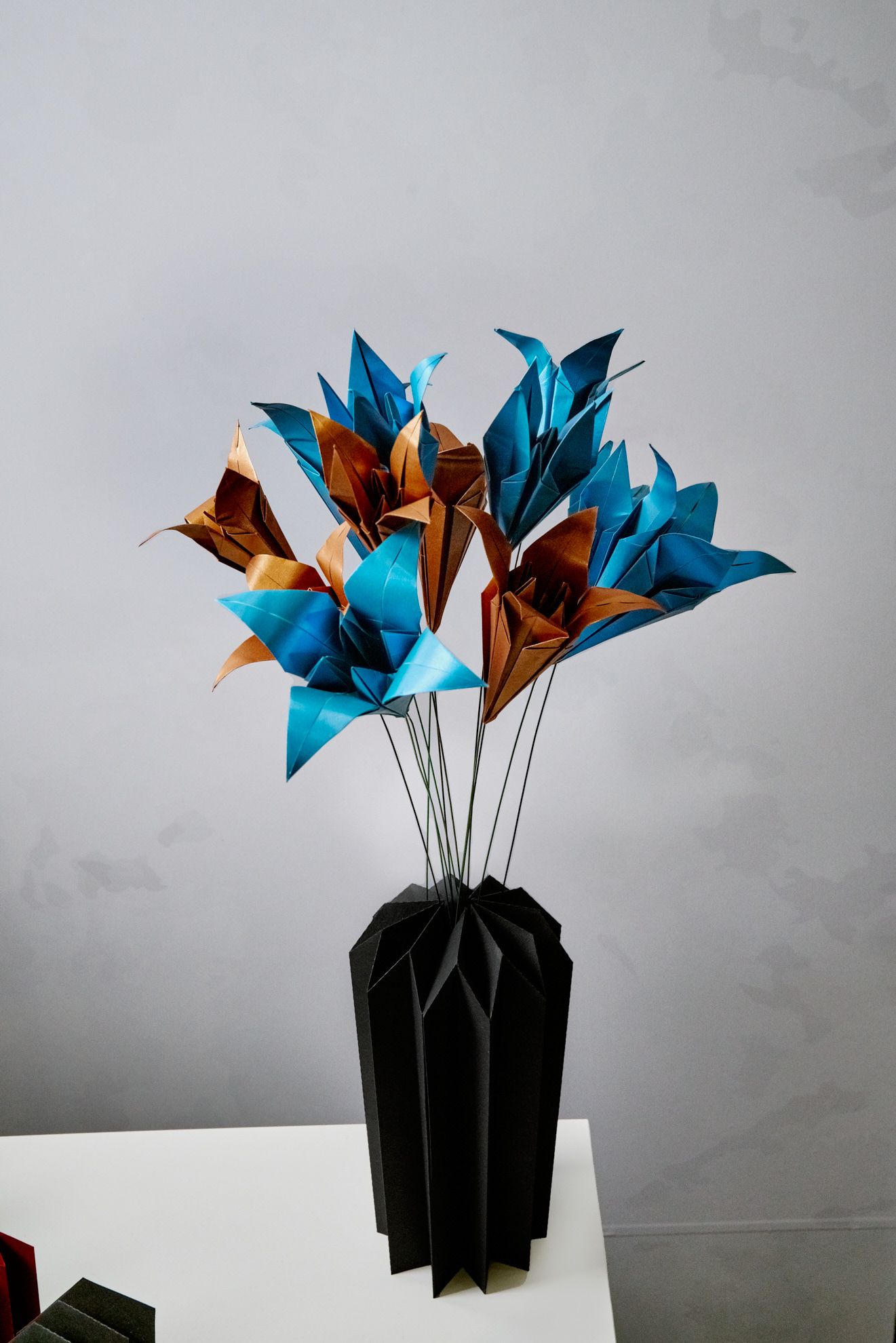 Creamos el nombre de la marca usando los colores corporativos y creando cada una de las letras con origami. Lo acompañamos de un jarrón de origami con lirios de papel.