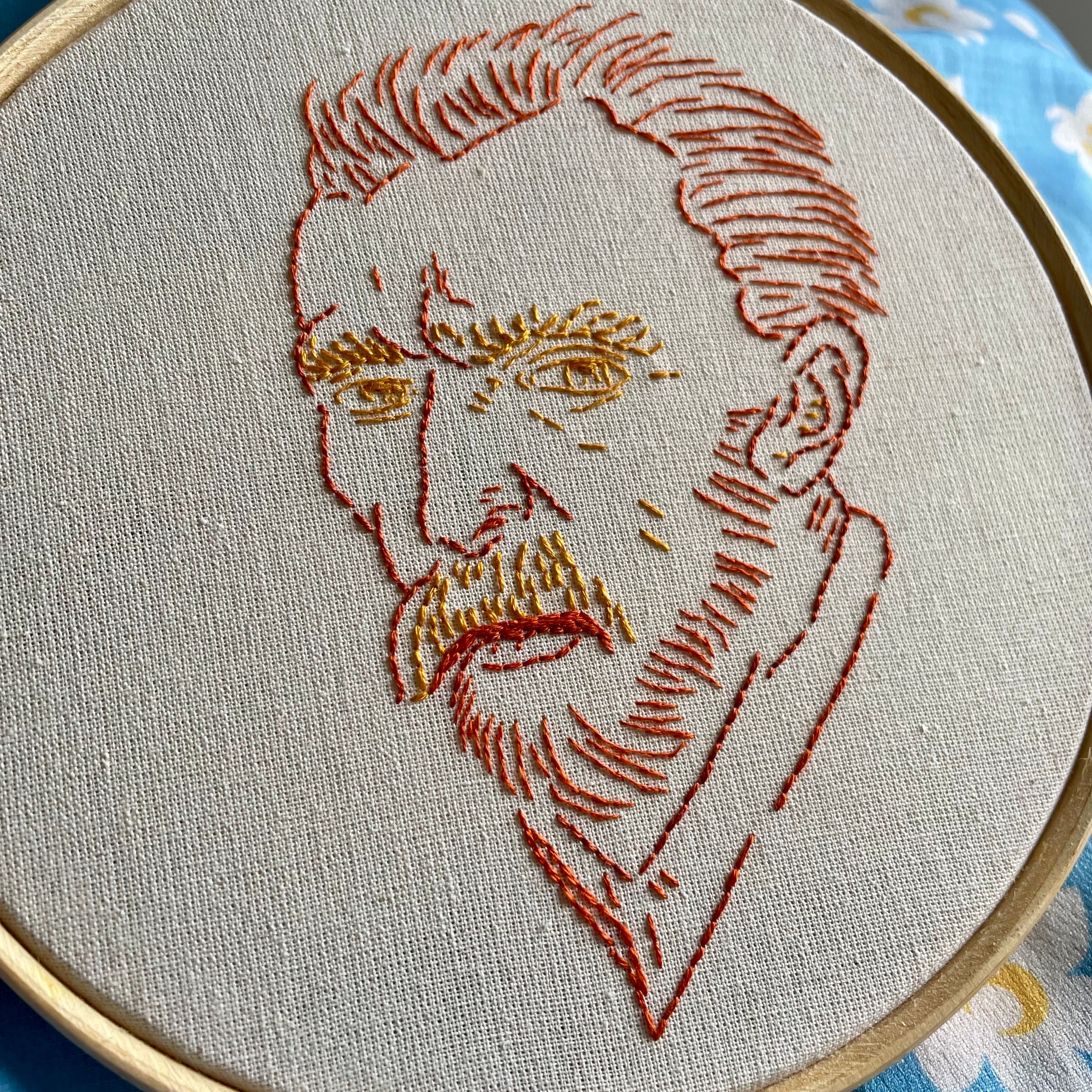 Optei por fazer um retrato do pintor impressionista Vincent Van Gogh em tons quentes monocromáticos ( usei três numerações de laranja terrosos e uma numeração amarela). Os pontos utilizados foram ponto atrás, ponto cheio e ponto partido. Para os contornos, sobrancelhas e bigode utilizei duas linhas na agulha e para os demais itens do retrato optei por apenas uma linha para suavizar os traços.