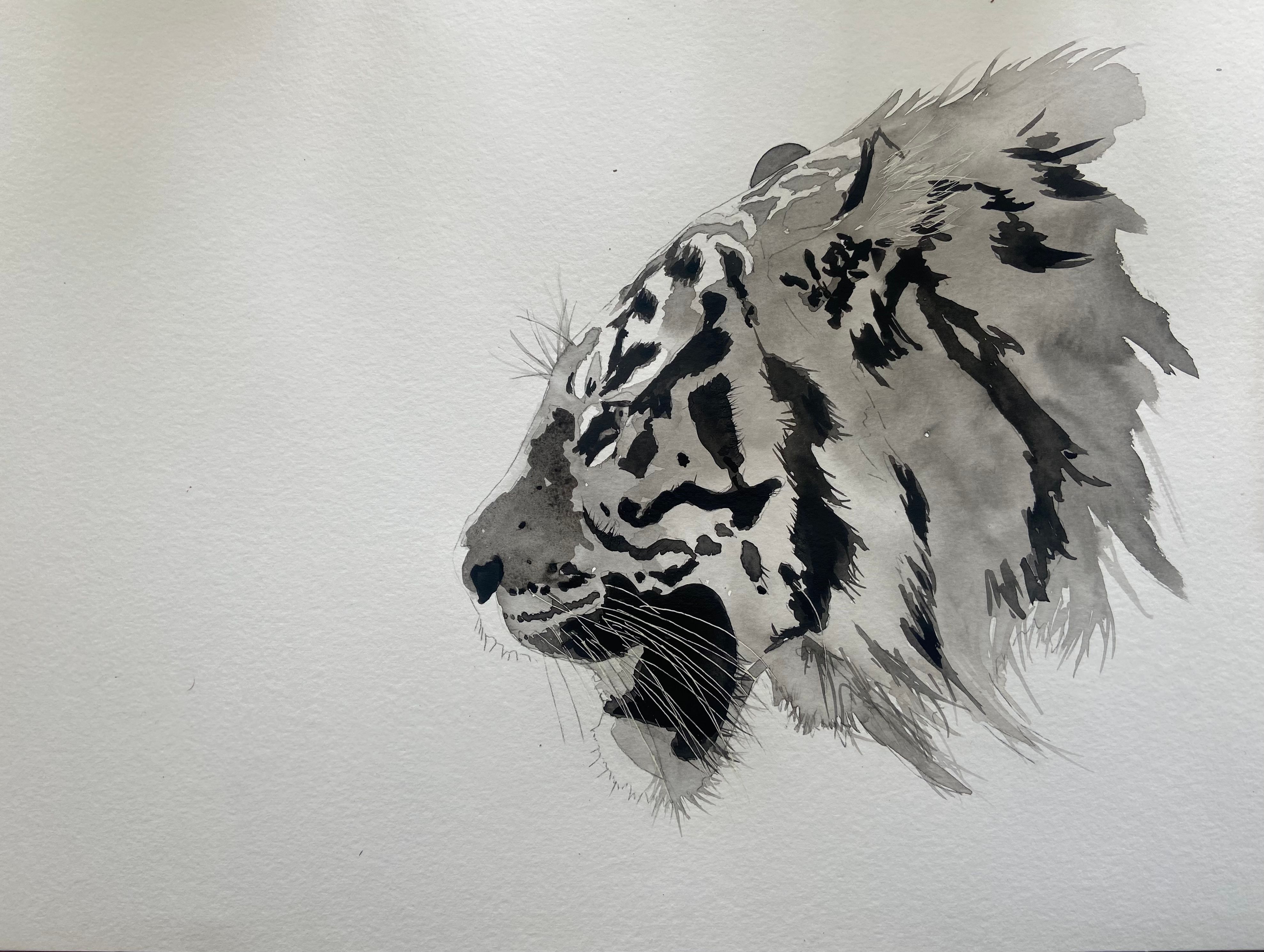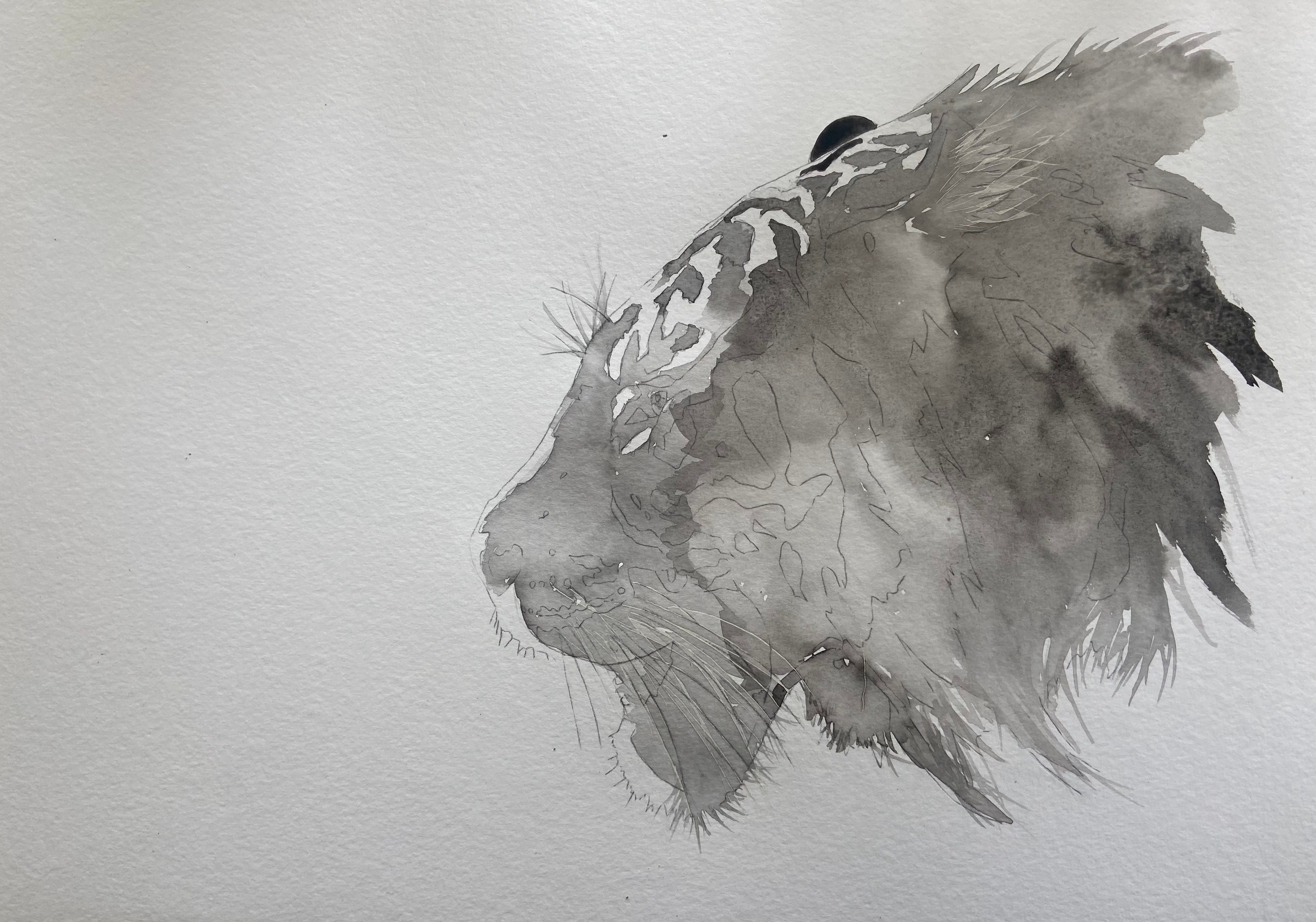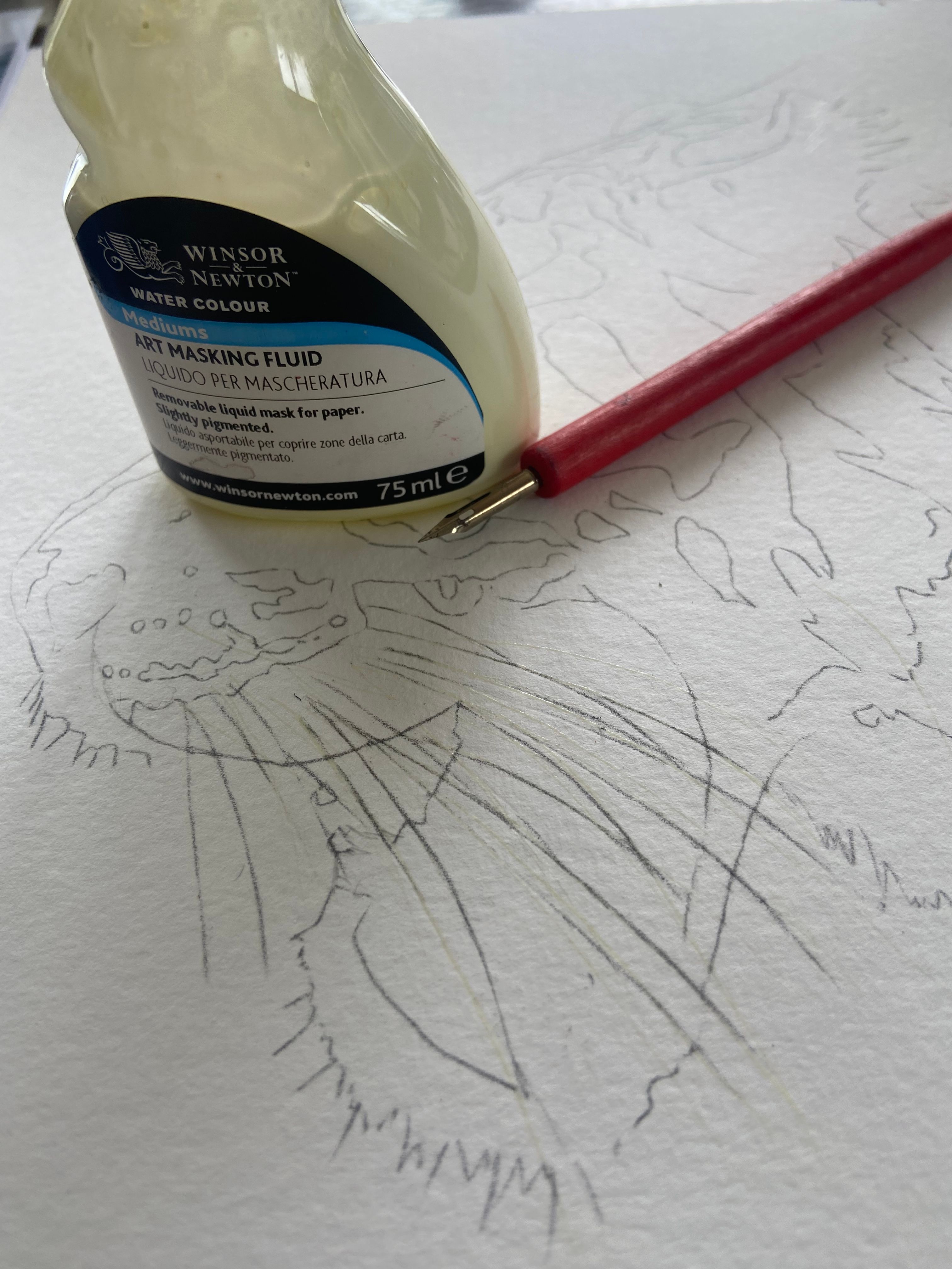 Piece finished off. Masking fluid removed. Whites “knocked back” with a little pigment… watercolour and white acrylic Mid tones now added wet on dry and creamy into damp Then straight for darks as it’ll help to ascertain mid tones laterFirst wash leaving highlights white Whiskers masked out The drawing denoting shapes and tones