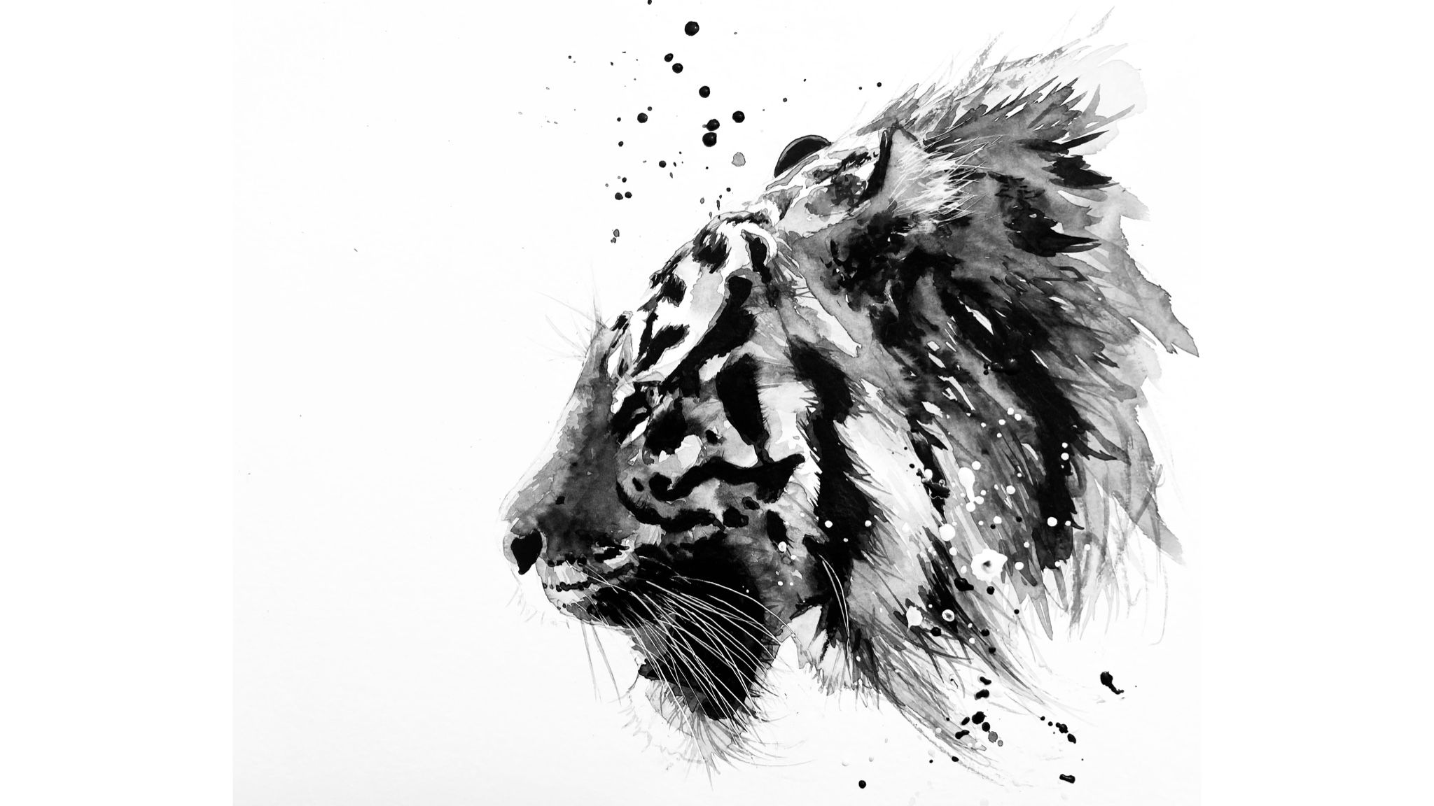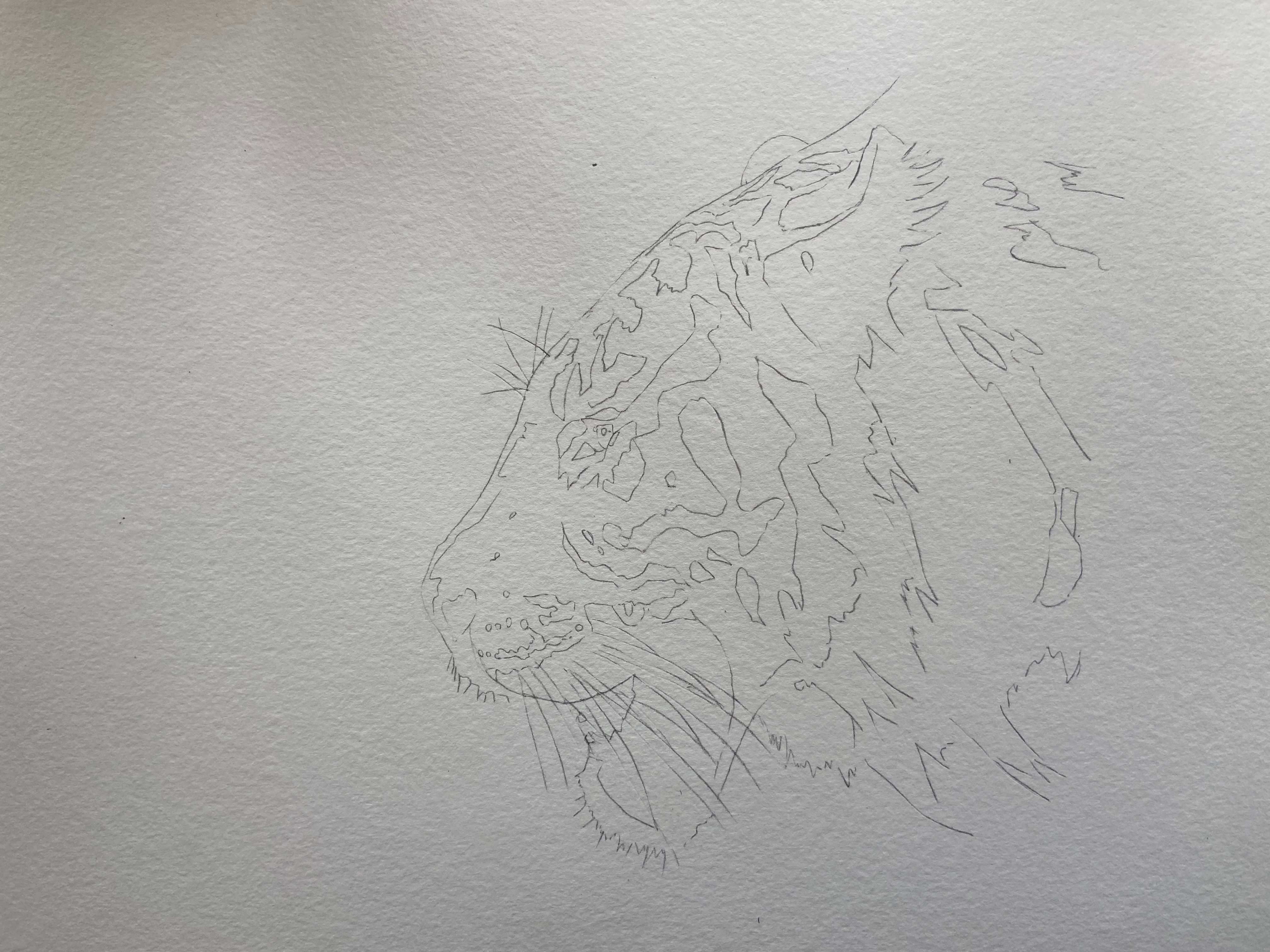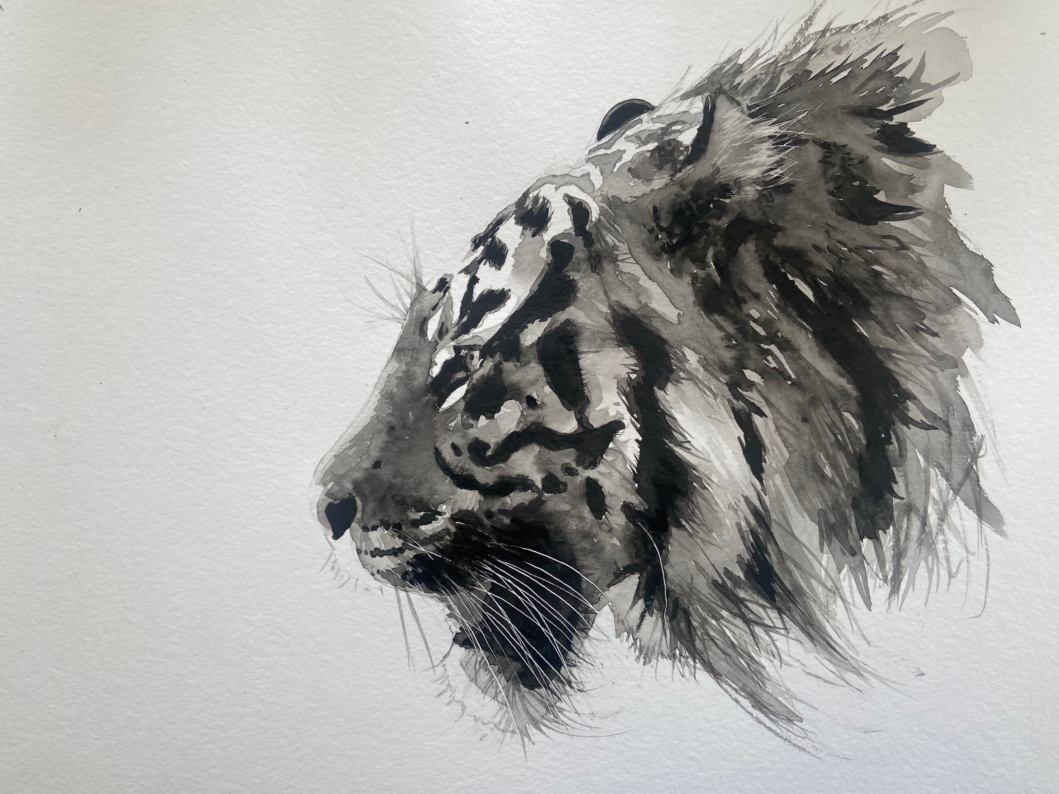 Piece finished off. Masking fluid removed. Whites “knocked back” with a little pigment… watercolour and white acrylic Mid tones now added wet on dry and creamy into damp Then straight for darks as it’ll help to ascertain mid tones laterFirst wash leaving highlights white Whiskers masked out The drawing denoting shapes and tones