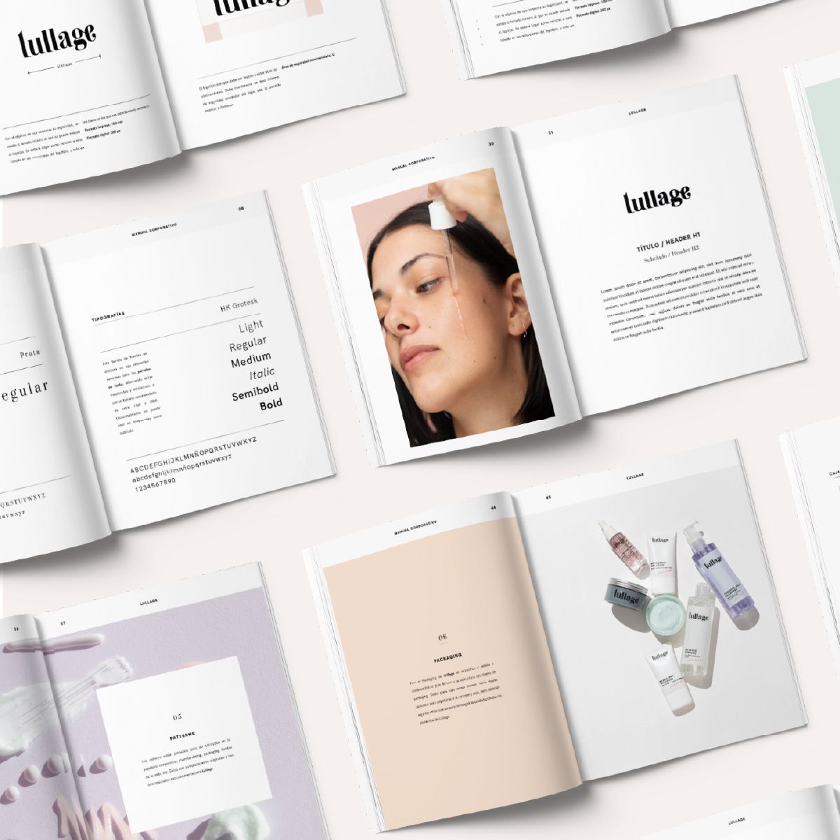 La paleta de colores es de gran importancia dentro de la marca Lullage, por su naturaleza colorista y su vitalidad. Se juega con un tono principal suave, blush, combinado con un tono potente y lleno de energía como es el rojo. Ambos son contrarrestados con tonos mint y lilas claros, que son femeninos pero sin ser obvios, creando, así, una paleta de colores de gran contraste y versatilidad para el diseño y las ilustraciones.