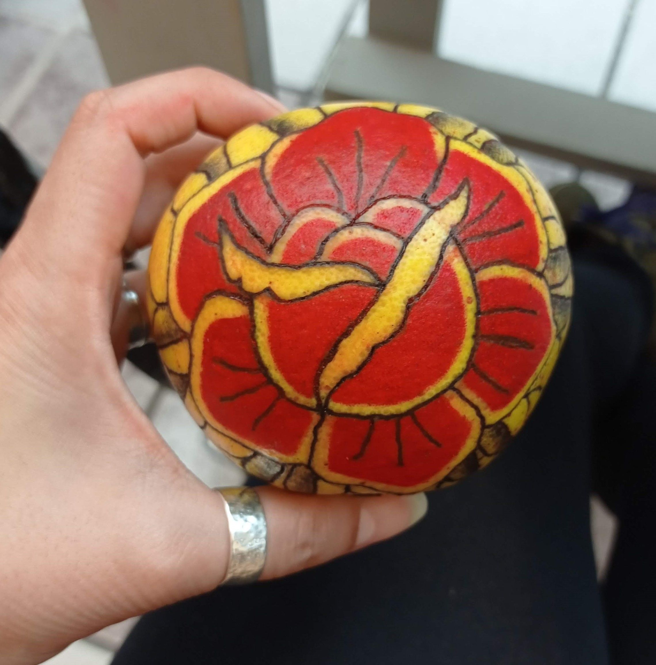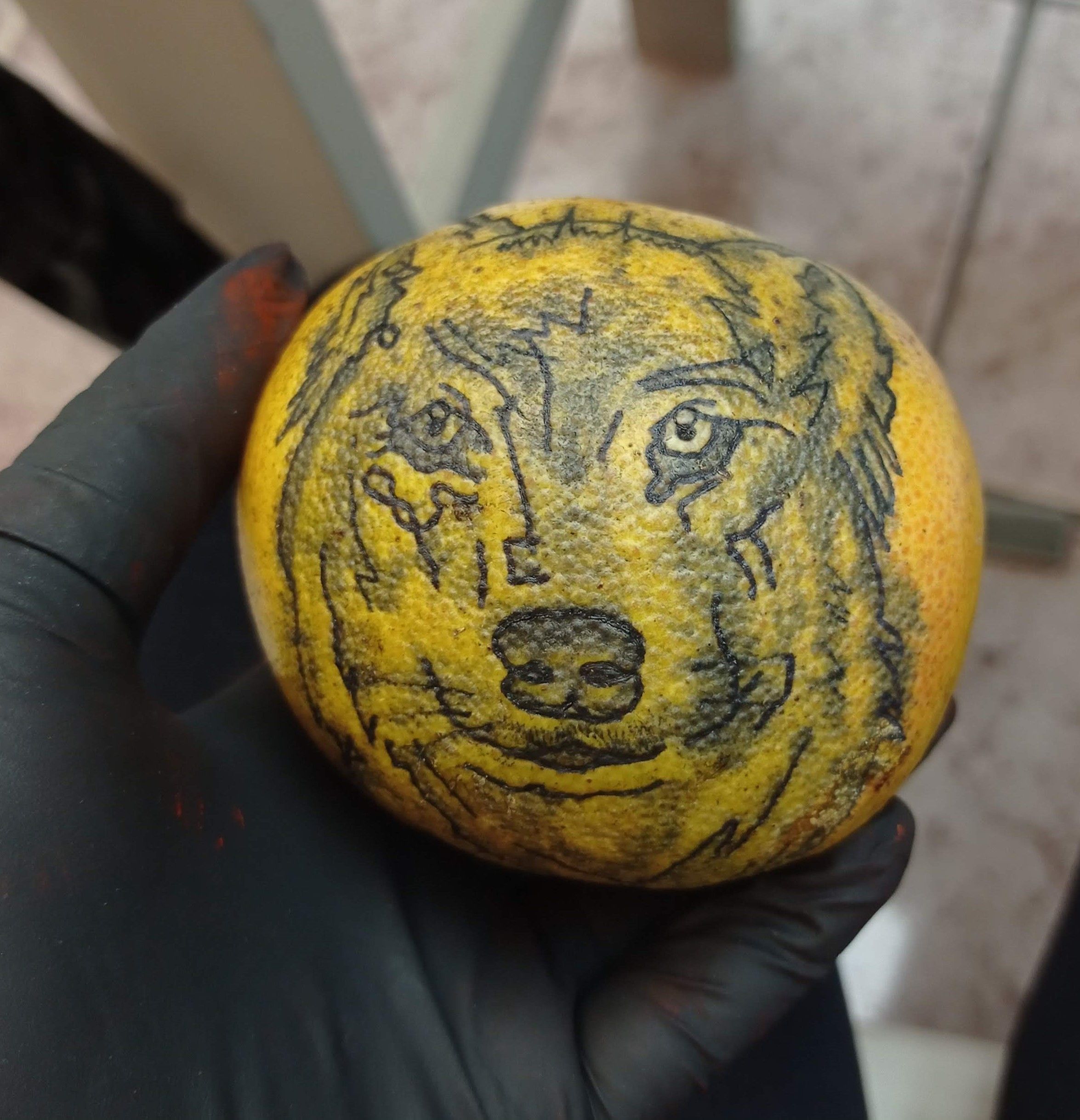 Tuve un tema con poder pegar el stencil sobre la naranja :( terminé dibujando con una pluma sobre ella por que con un sharpie me quedaba muy grueso el trazo... las primeras tres naranjas creo que me ayudaron a soltar la mano :)...