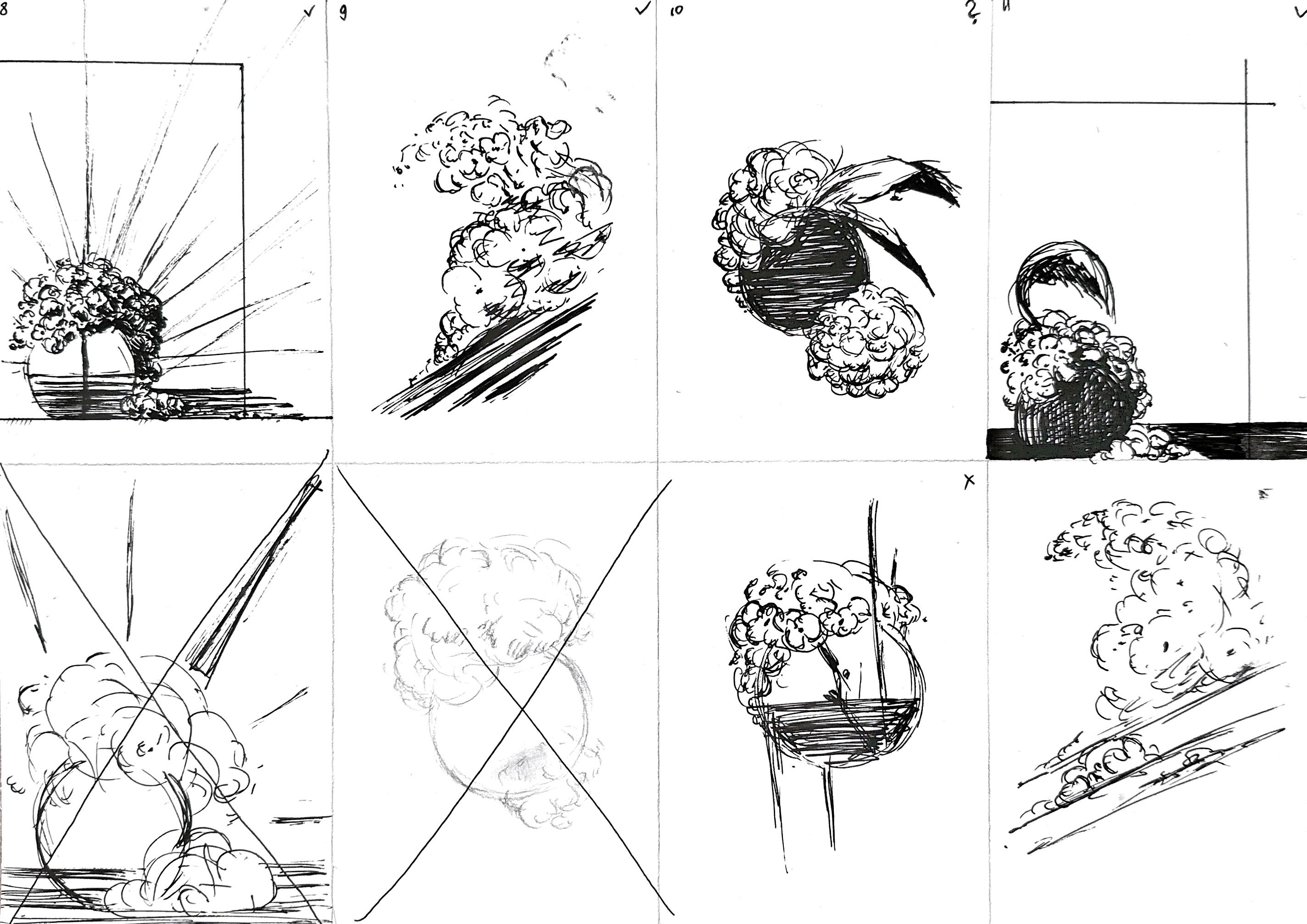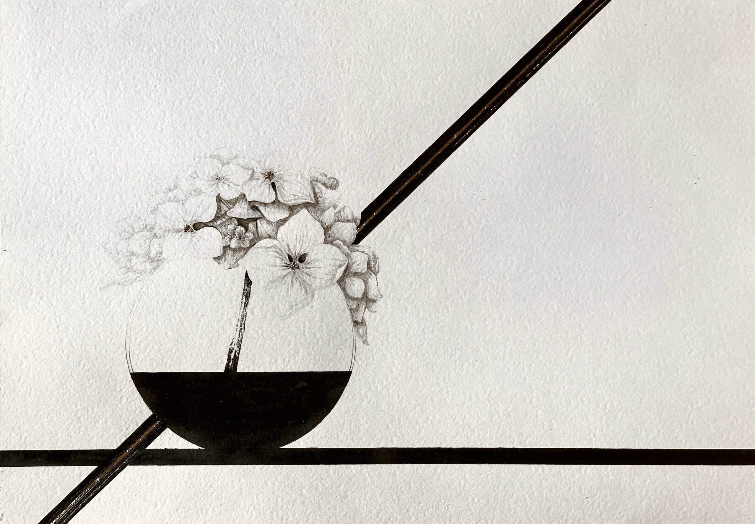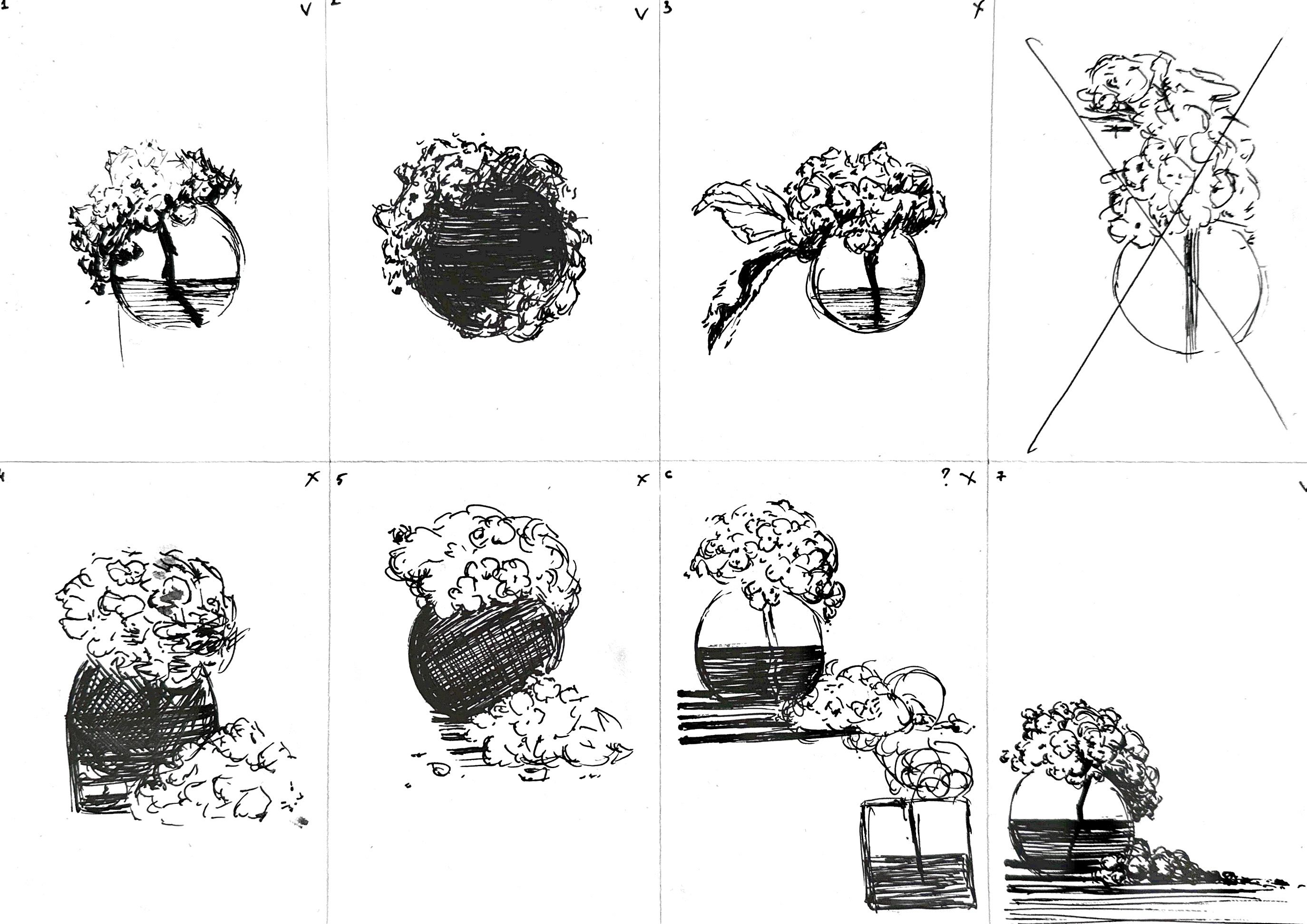 I’ve started by choosing the object. I wished to find something with fine texture and layered enough. The shape of this round vase is very simple, and I wanted to balance this with textured flowers.