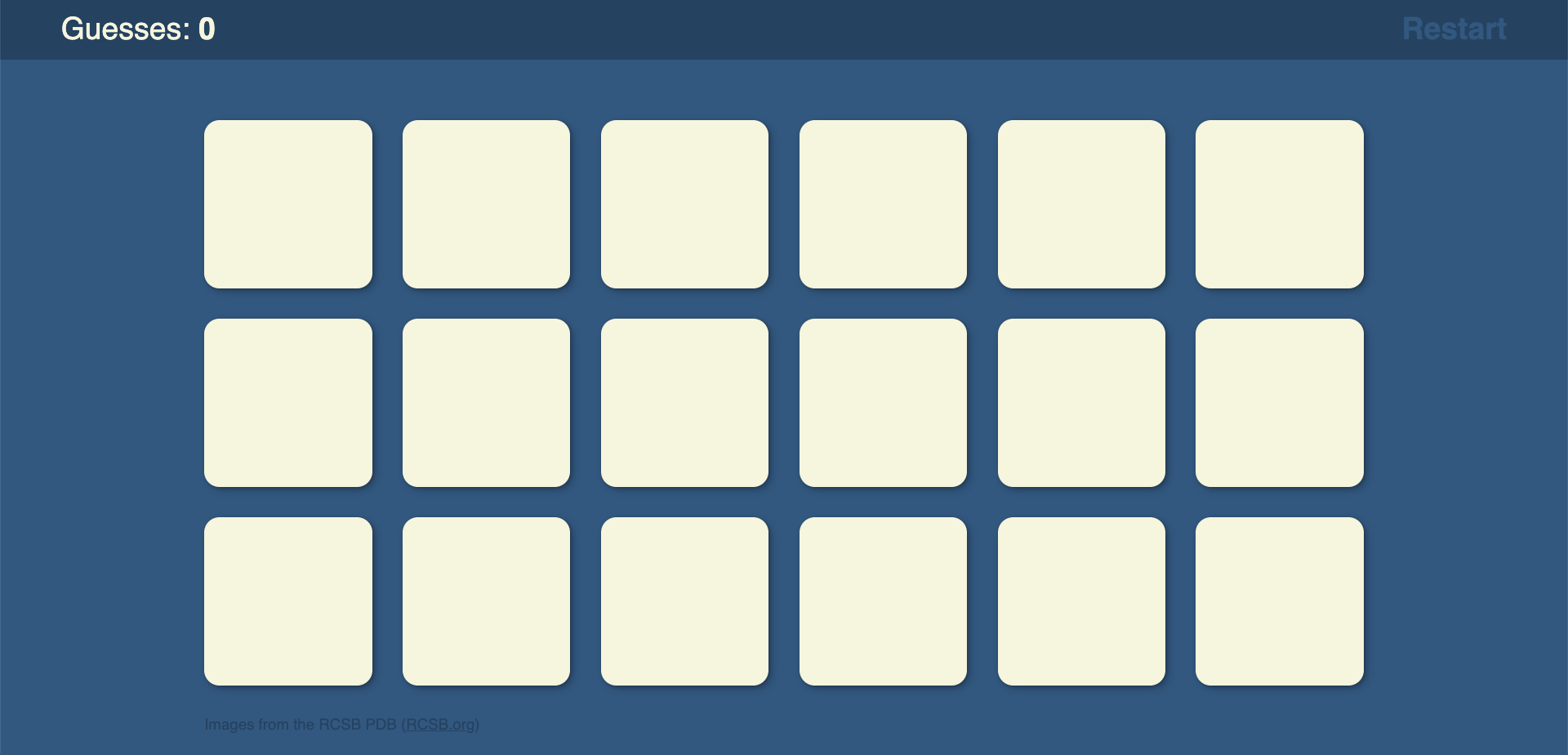 For this project, I have created a memory game with images from the Protein Data Bank (PDB), a database of protein structures. A random set of database entries is selected from a list of identifiers when the page is loaded.