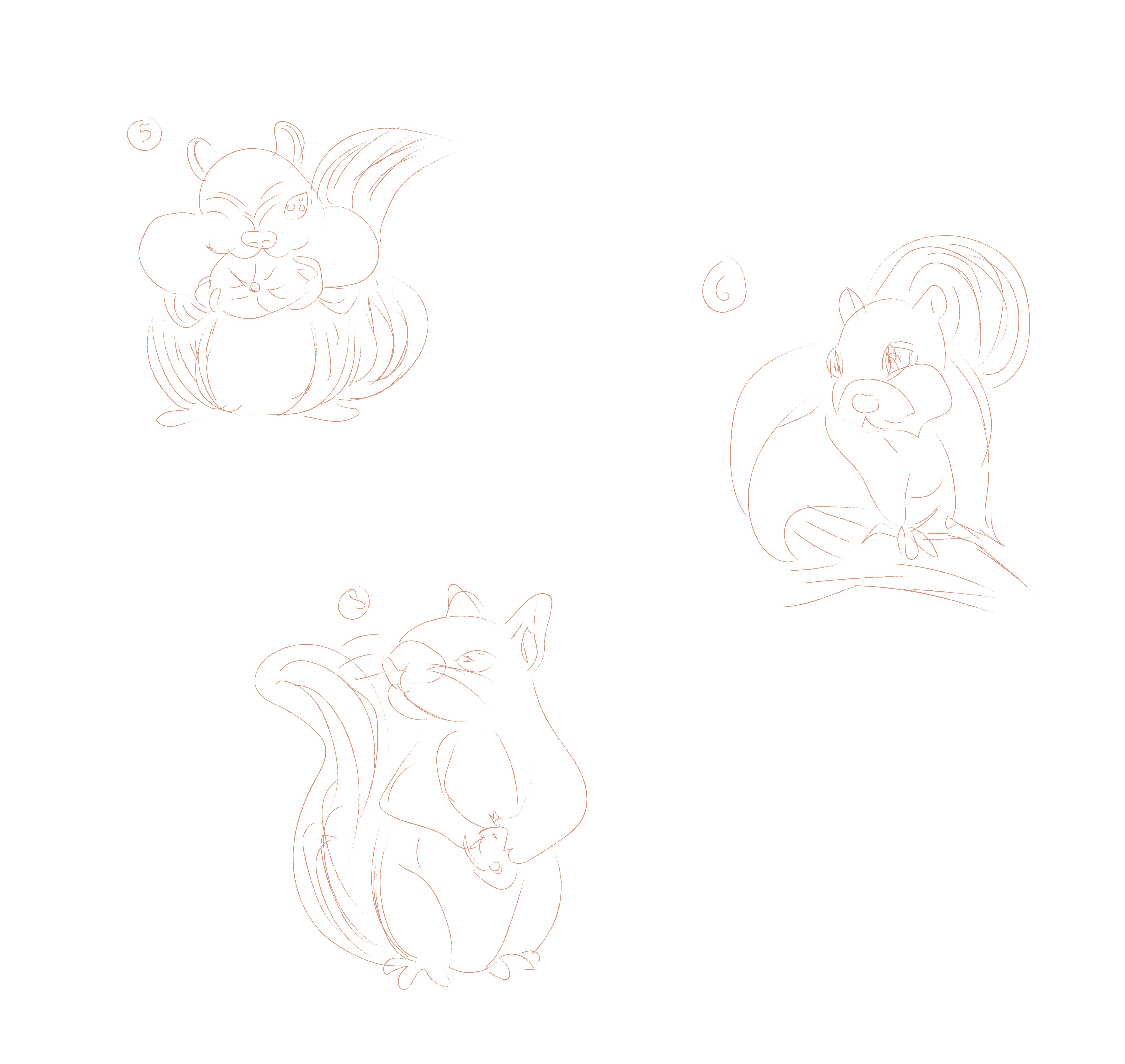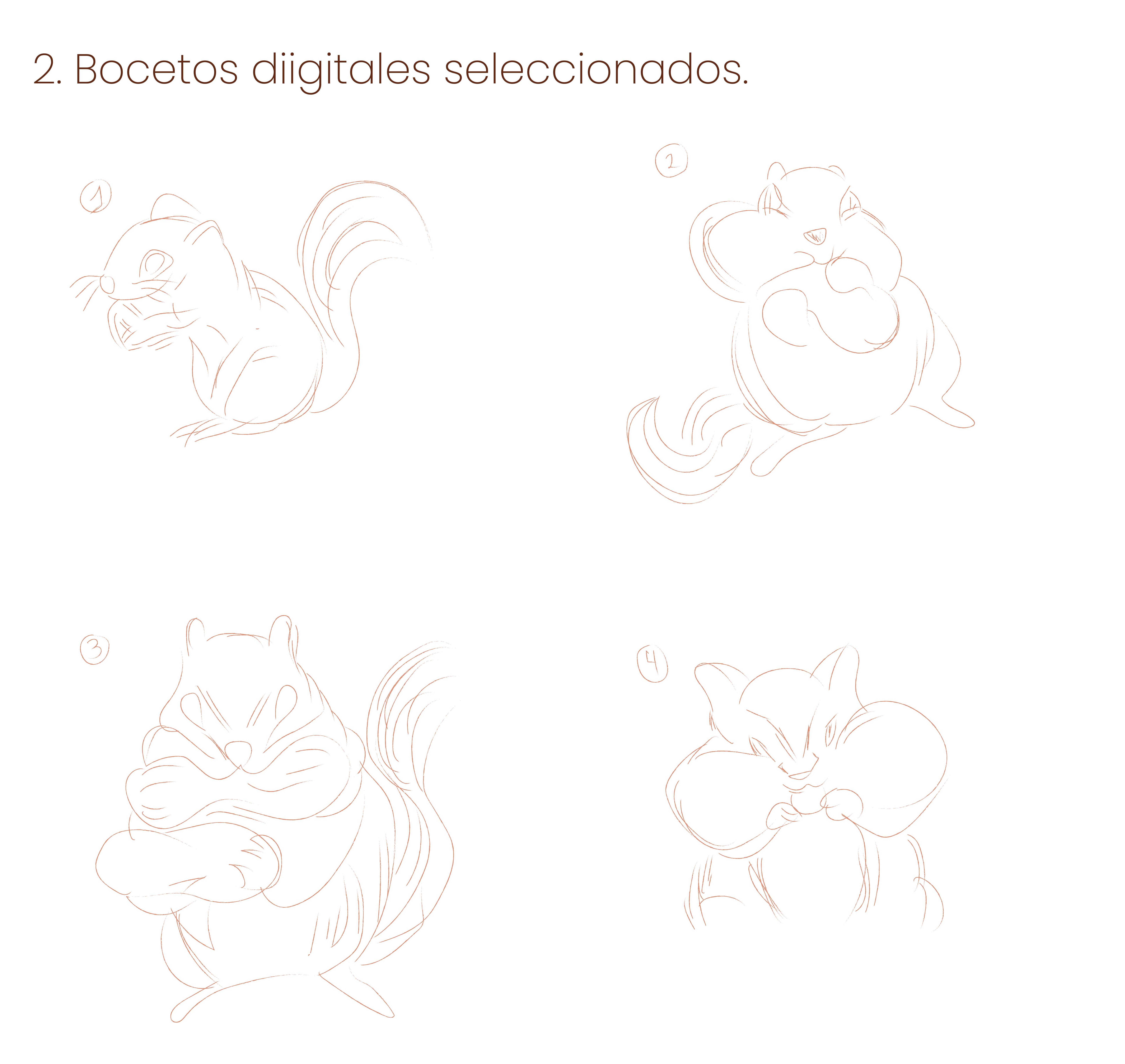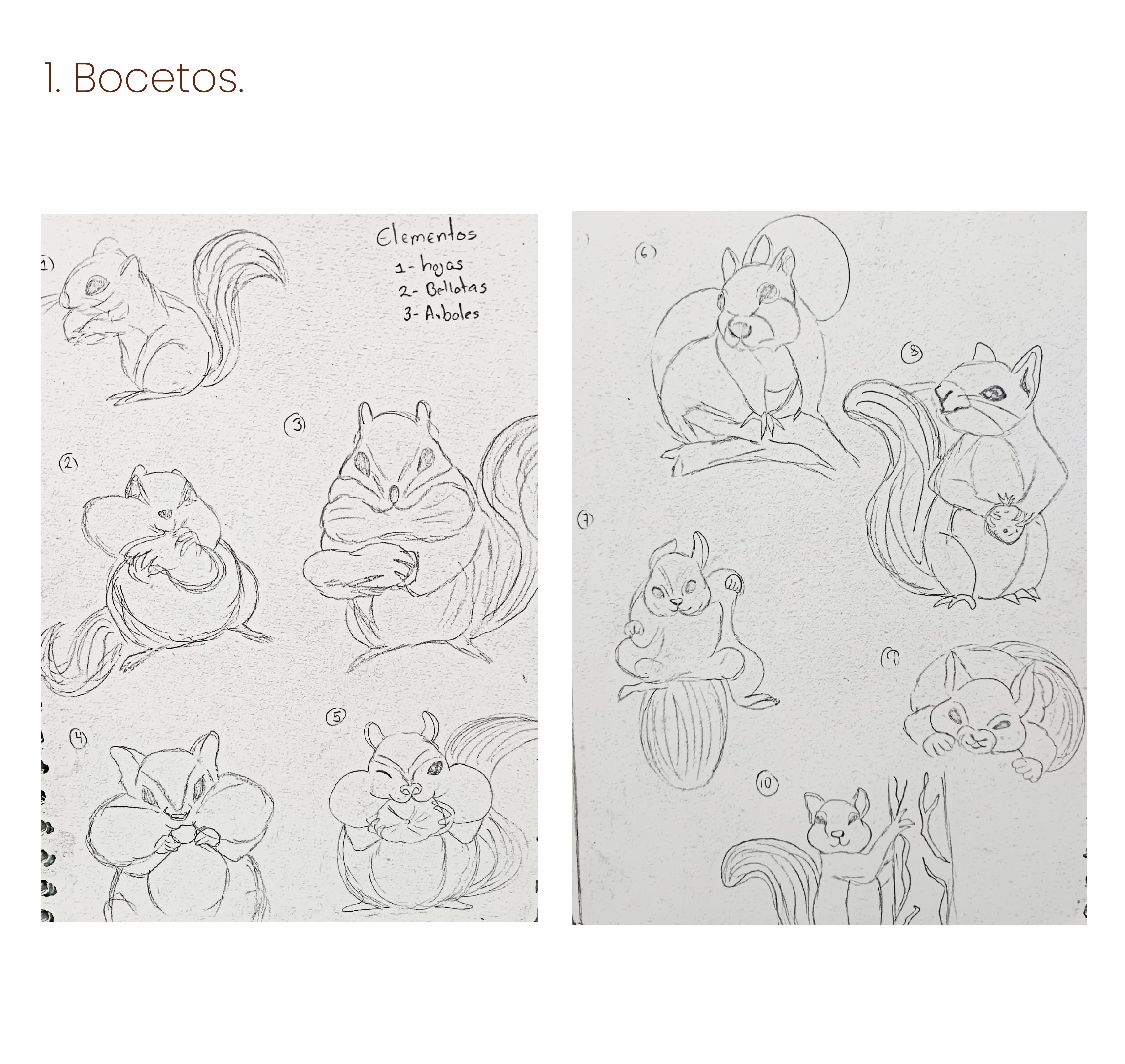 Estos fueron mis bocetos, decidí hacer una ardilla principalmente porque me gustan, son mi animal favorito y segundo por qué me parecen unos seres extraordinarios, trabajadores e interesantes.