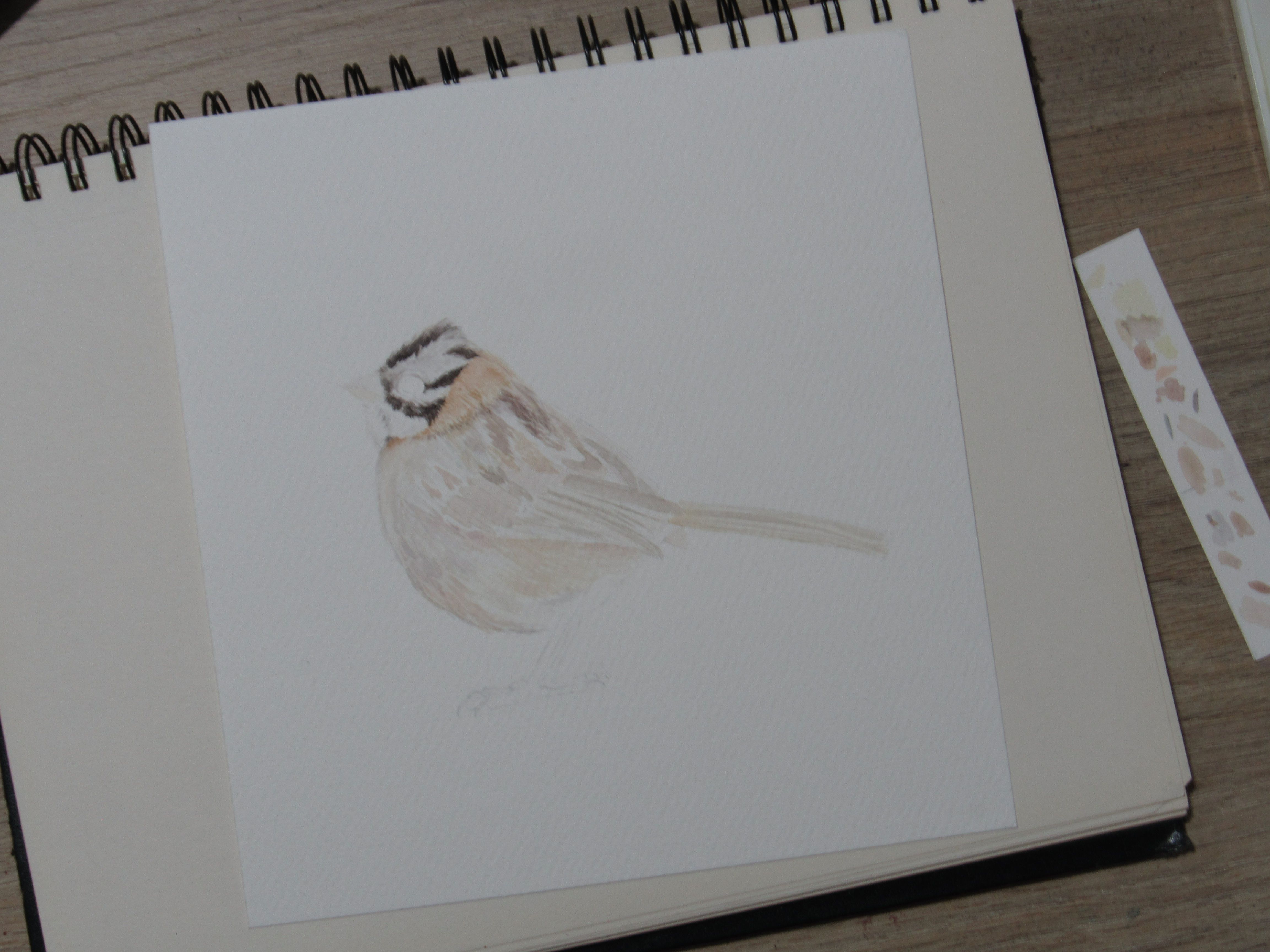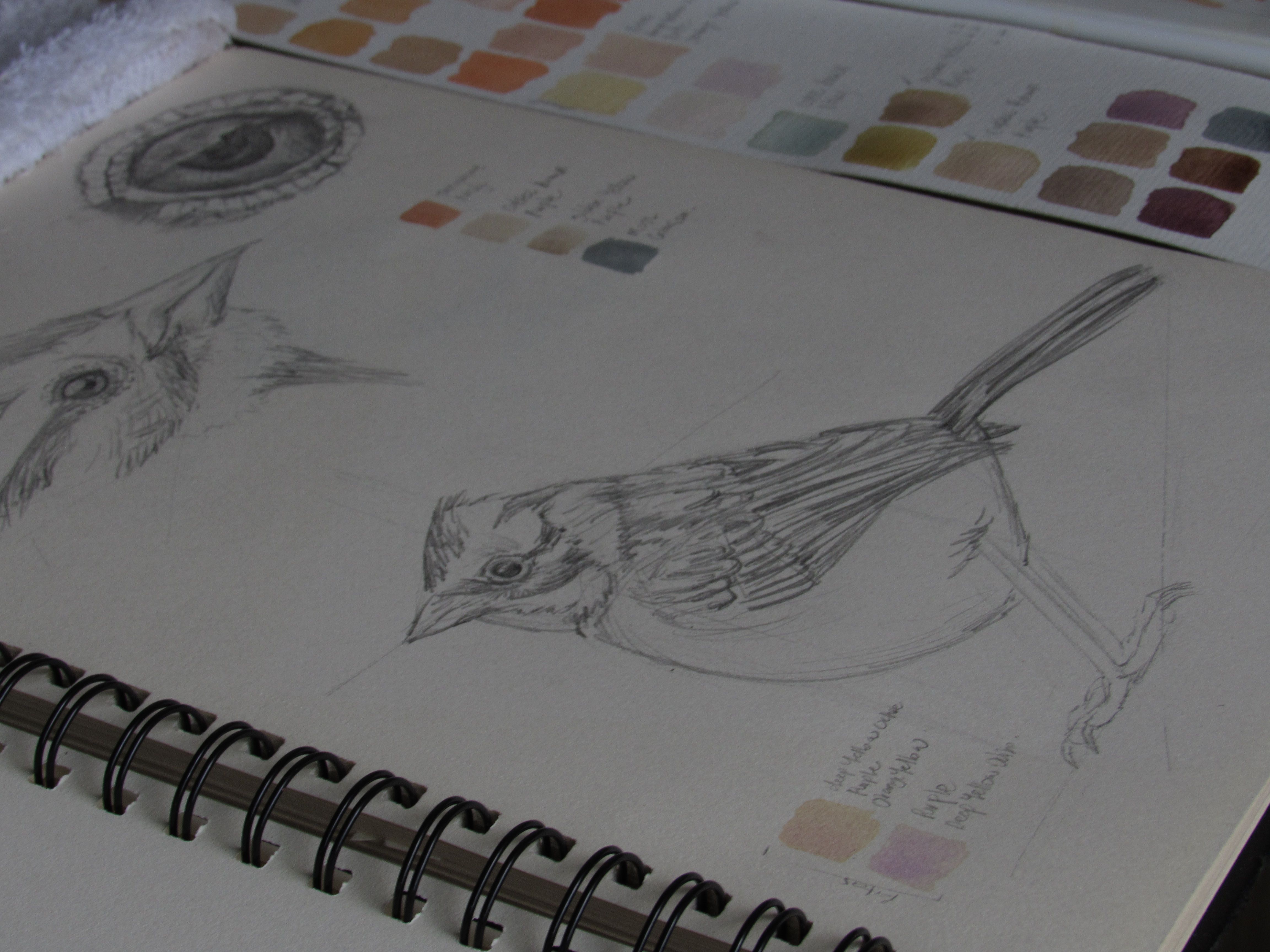En esta etapa, una vez realizada la transferencia del boceto al papel acuarela, apliqué las primeras capas de color, muy diluidas, de manera que me permitiera demarcar cada zona de acuerdo al patrón de coloración del ave y la dirección.