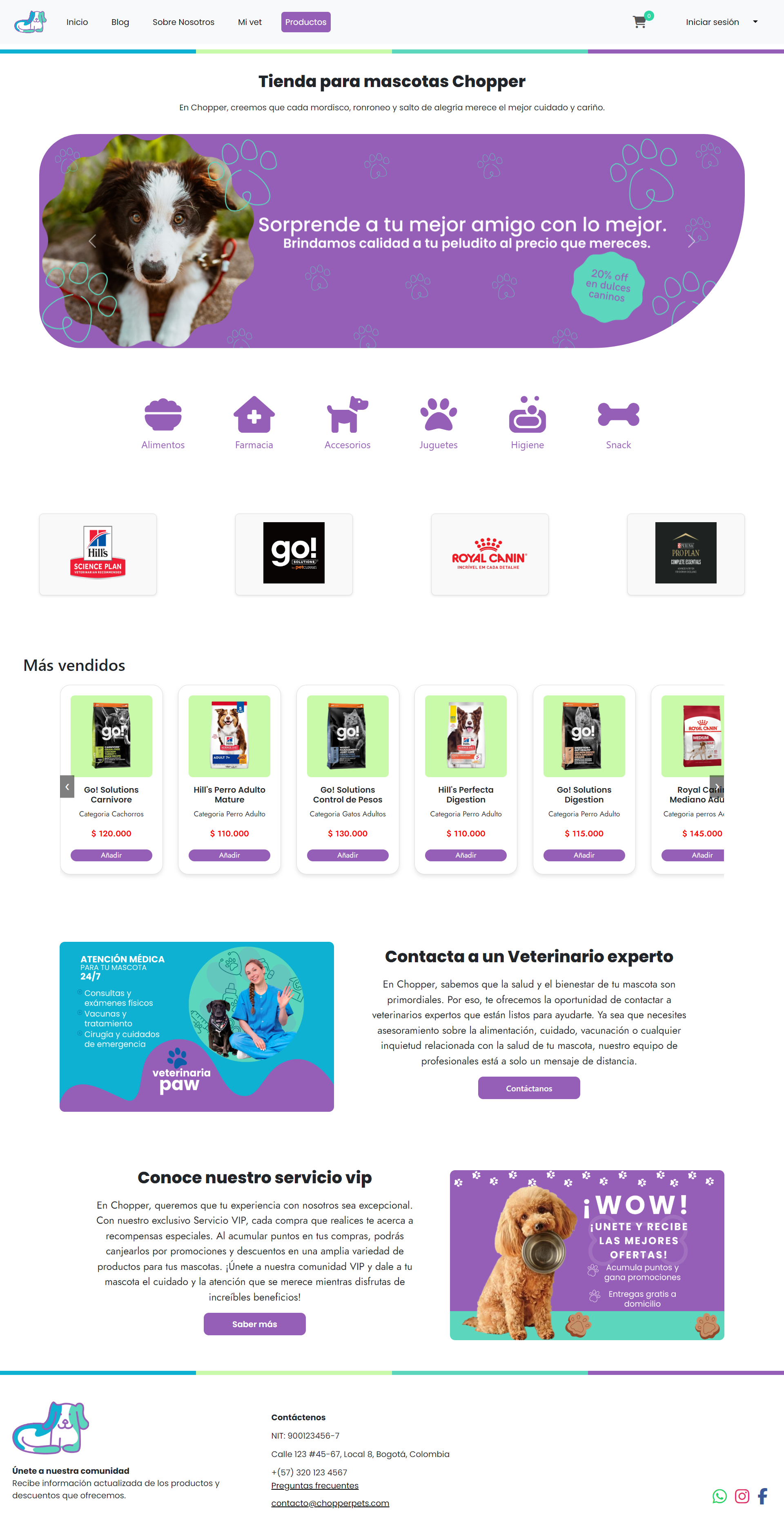 Chopper es una tienda virtual para mascotas desarrollada por un equipo de trabajo, en la que diseñamos el prototipo utilizando Figma. Este proyecto se inspira en el modelo PetsLover, con el objetivo de crear una conexión cómoda y eficiente entre los dueños de mascotas y los profesionales del cuidado animal. La plataforma está pensada para facilitar el acceso a productos y servicios especializados, brindando una experiencia personalizada tanto para los dueños como para los expertos en el cuidado de mascotas.