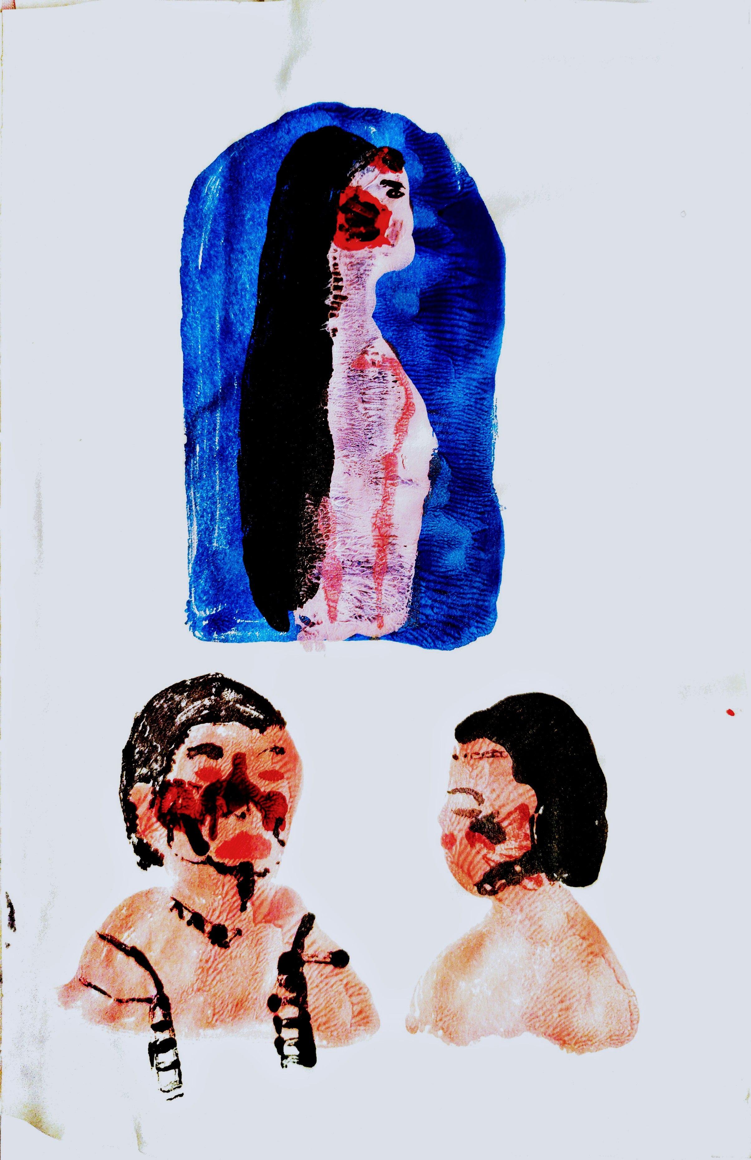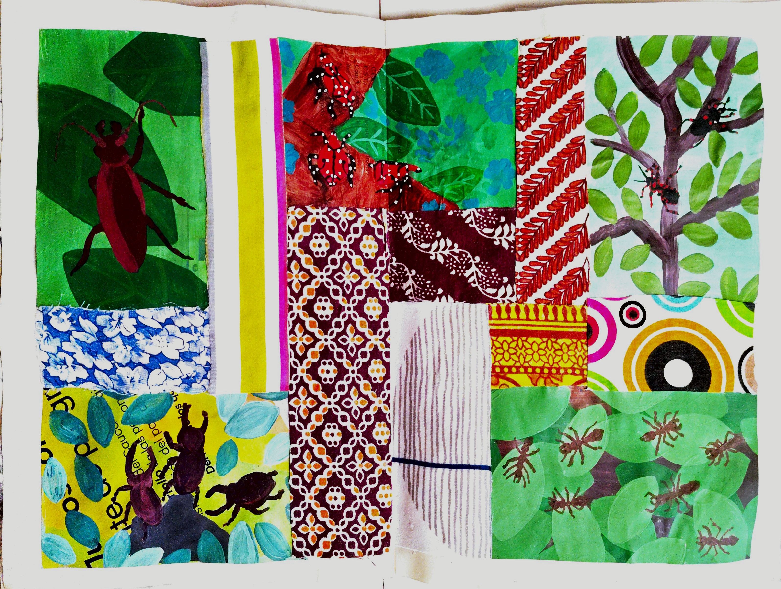 Para cada página de este SketchBook se usan distintos materiales: Lápices de colores, pintura acrílicas, tinta china, lápices de tinta, recortes de papel, tela, hilo, etcétera