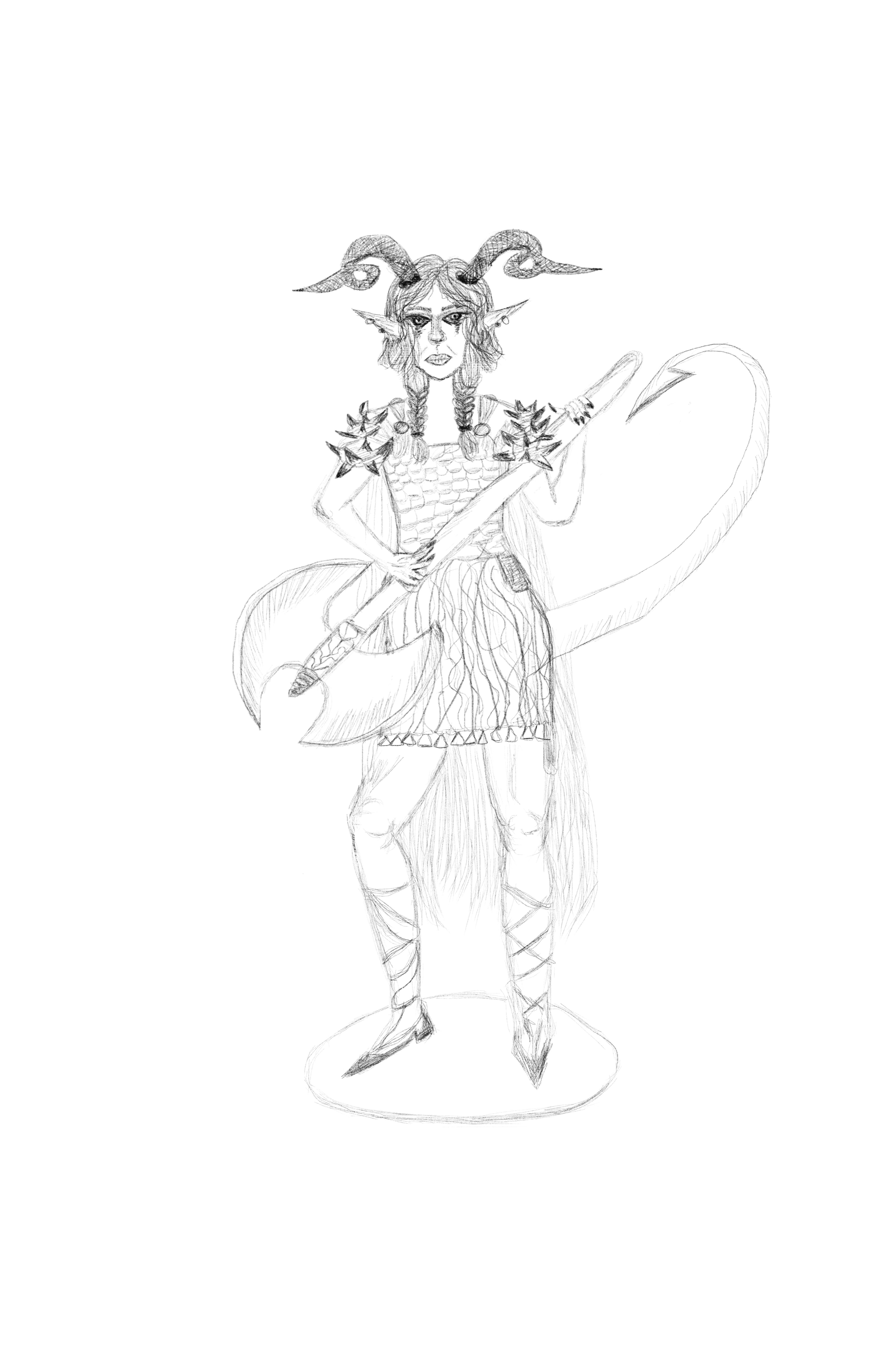 For the initial sketch, I used Adobe Fresco since it's a lightweight tool that didn't overwhelm me with too many features—allowing me to keep this step simple. In the sketch, she has dark, deep facial features and wields a double-bladed axe.