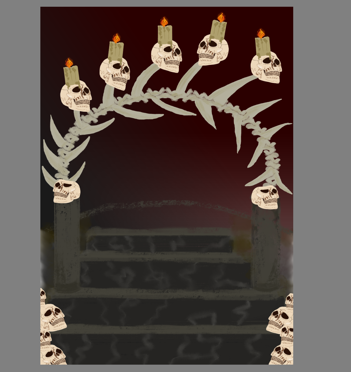 I began by visualizing my character's final pose and the environment that would showcase her presence. She sits cross-legged on an oddly shaped altar, surrounded by skulls and bones, sipping wine from an ornate goblet.