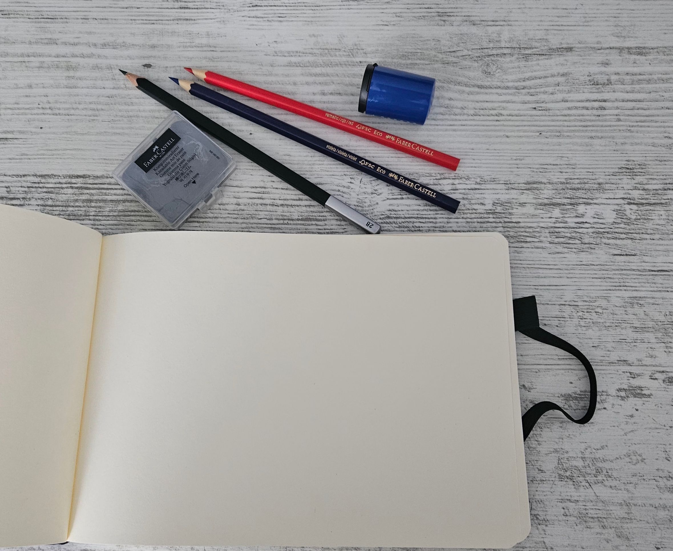 For the traditional drawings I have used my Sakura sketchbook, a Moleskine 2B pencil, Faber-Castell coloured pencils (Red and Violet) and my reliable kneadable art eraser from Faber-Castell.