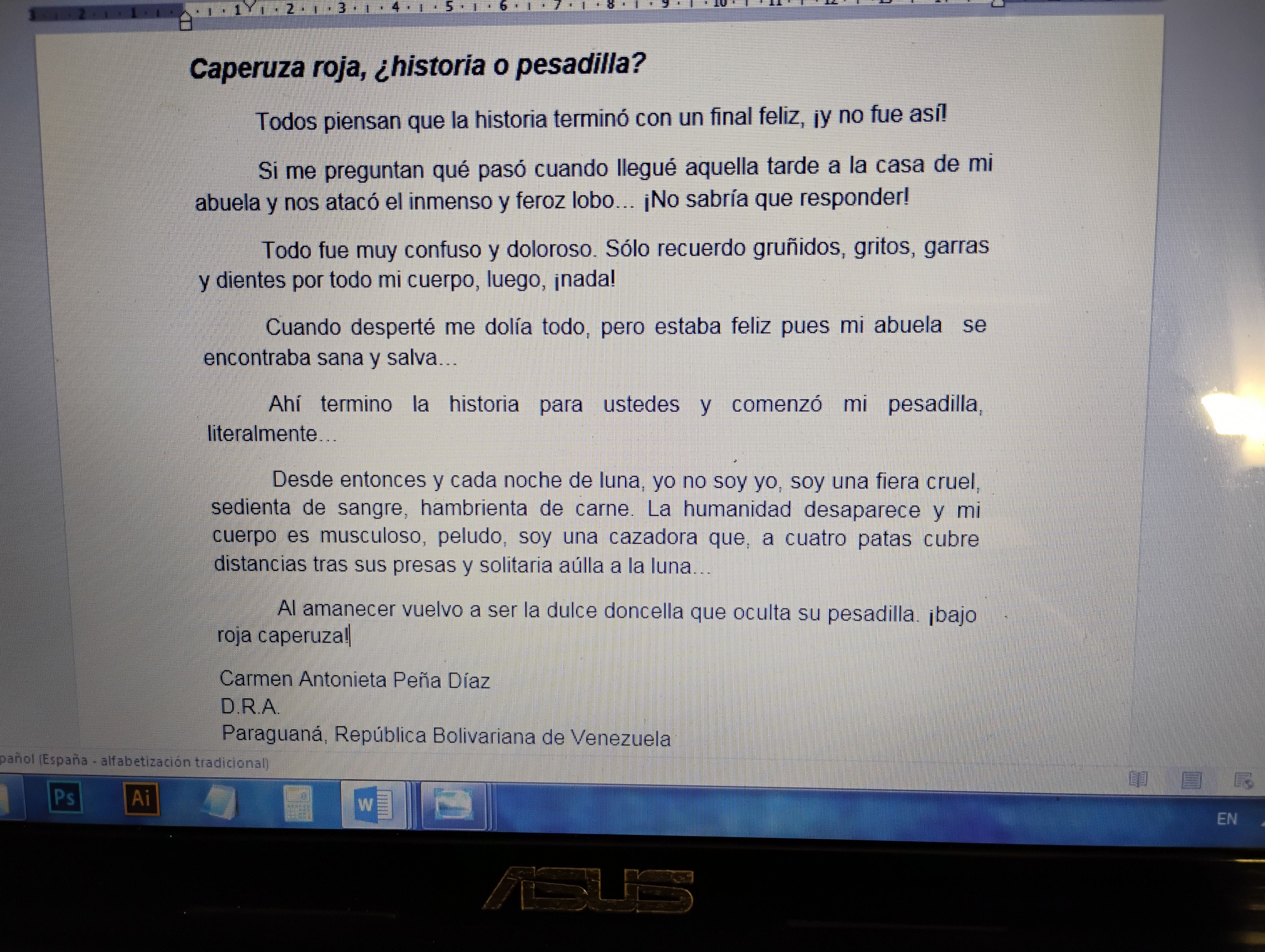 Inicié mi historia con el final del cuento original y me fui adentrando en el giro de pesadilla de la historia hasta llegar al momento dramático de la misma. Pienso que de esa manera captaré la atención y empatía del lector.