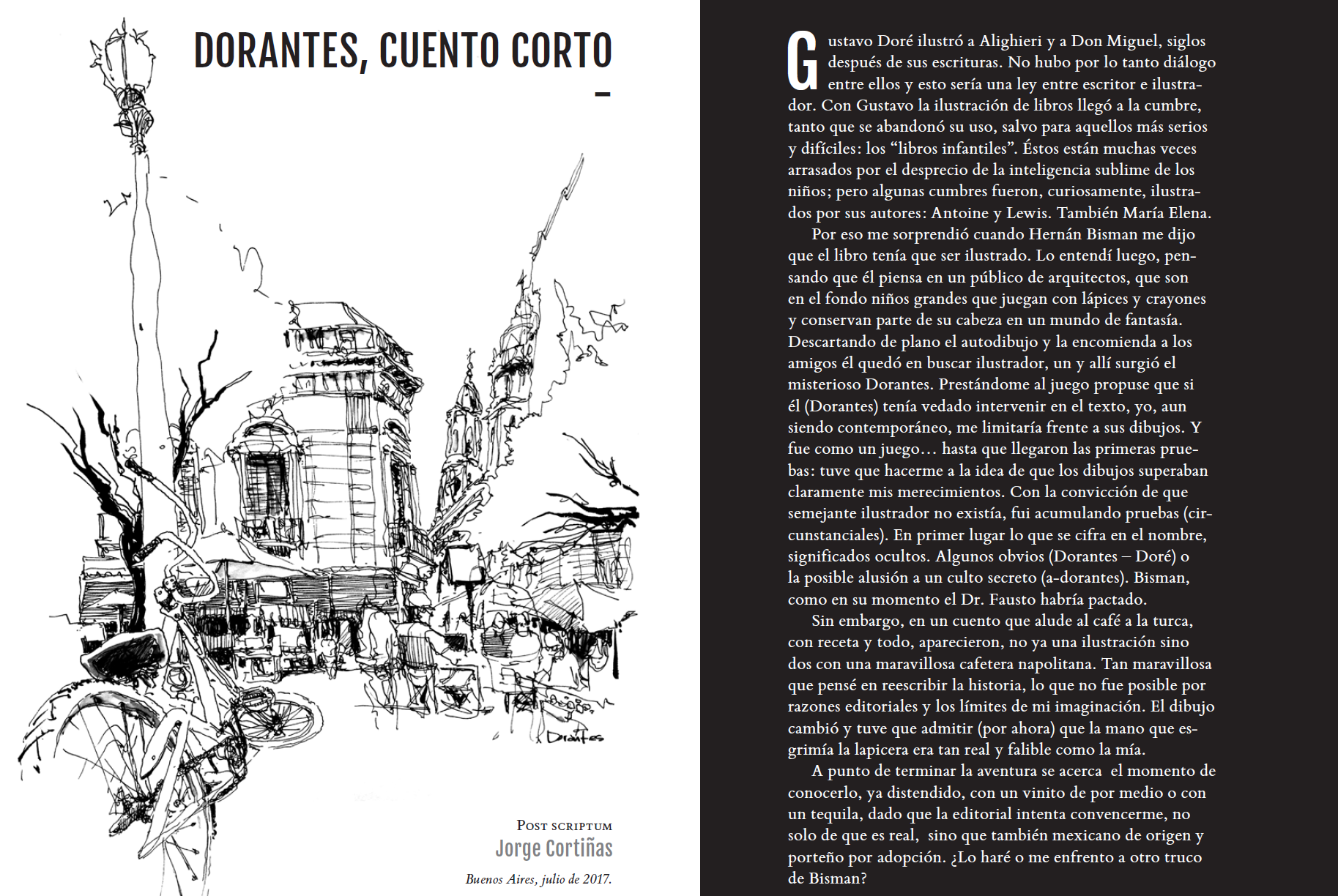 Ahi surgió la idea de invitarme. Recibí los textos, los lei y me centre en uno de los cuentos como para arrancar a proponer cual podría ser el espíritu y la estética de los dibujos. Después del primer dibujo (que justamente termino siendo la ilustración de la tapa sin una sola modificación) llegamos a la conclusion de que NO íbamos a tener intercambio directo entre el autor de los textos y yo como autor de los dibujos y que a su vez ni él ni yo podíamos modificar lo que proponíamos. Fue un juego muy divertido y experiencia inedita para mí.