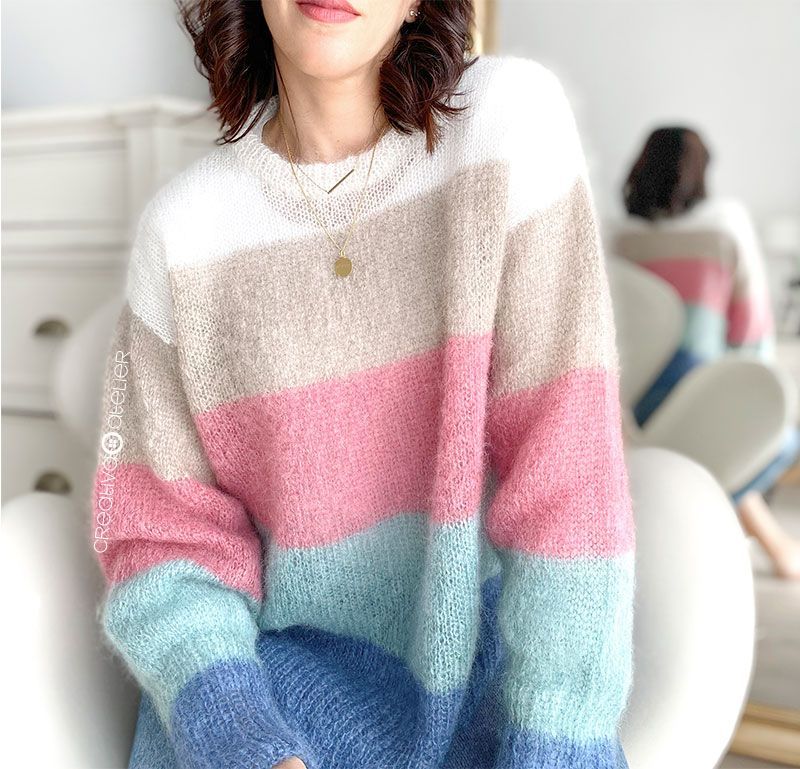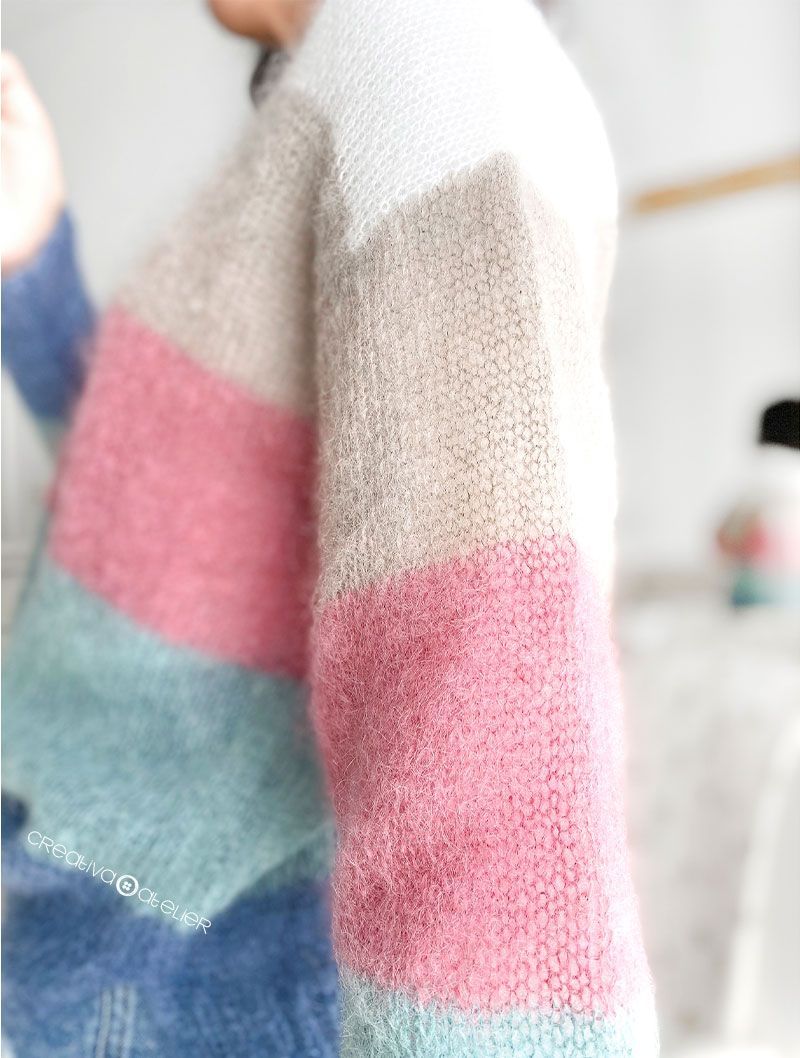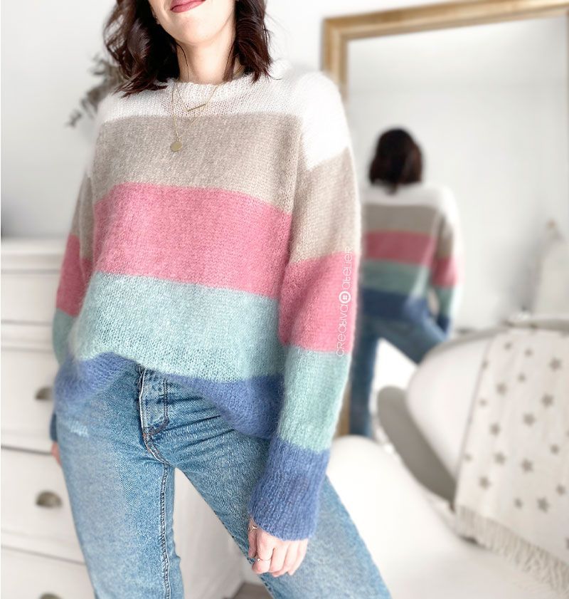 Teje este precioso Jersey de Punto de Mohair para combinando 5 colores o a un color liso ¡esa es tu elección! Una prenda básica. sencilla y muy versátil que podrás personalizar fácilmente a tu gusto. El Jersey CANDY CLOUD se teje plano en pasadas de ida y vuelta y en piezas separadas que iremos uniendo a lo largo del proceso.