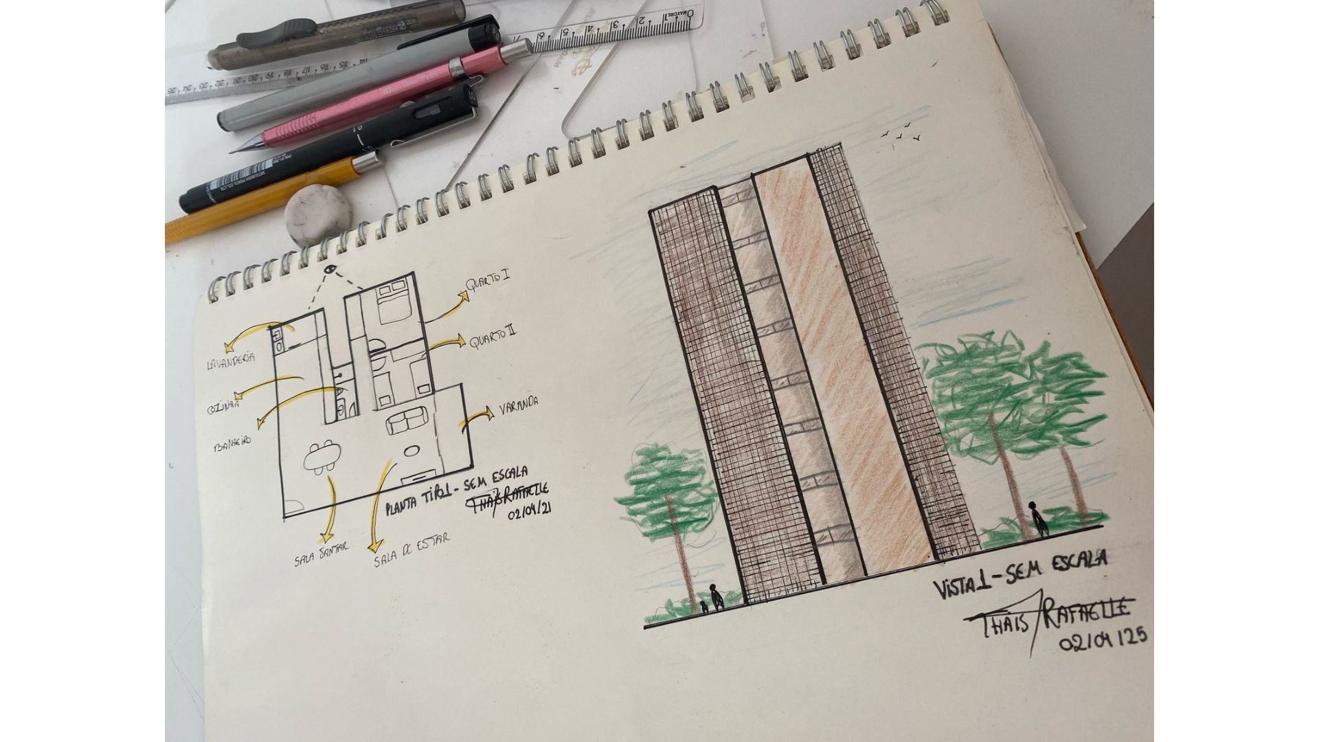 Para o desenvolvimento do projeto, utilizei caderno sketch para os croquis, lapiseiras para os traços precisos e fineliners para o acabamento técnico. A borracha plástica auxiliou nos ajustes, enquanto os esquadros garantiram a exatidão das linhas. Finalizei com lápis de cor, destacando elementos e enriquecendo a apresentação visual.