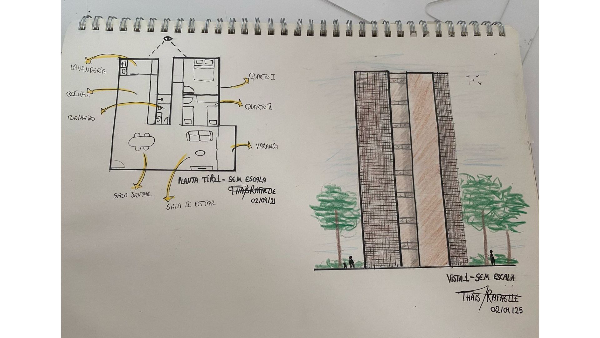 Nesta fase, realizei os primeiros traços do projeto no caderno sketch, explorando formas e composições.