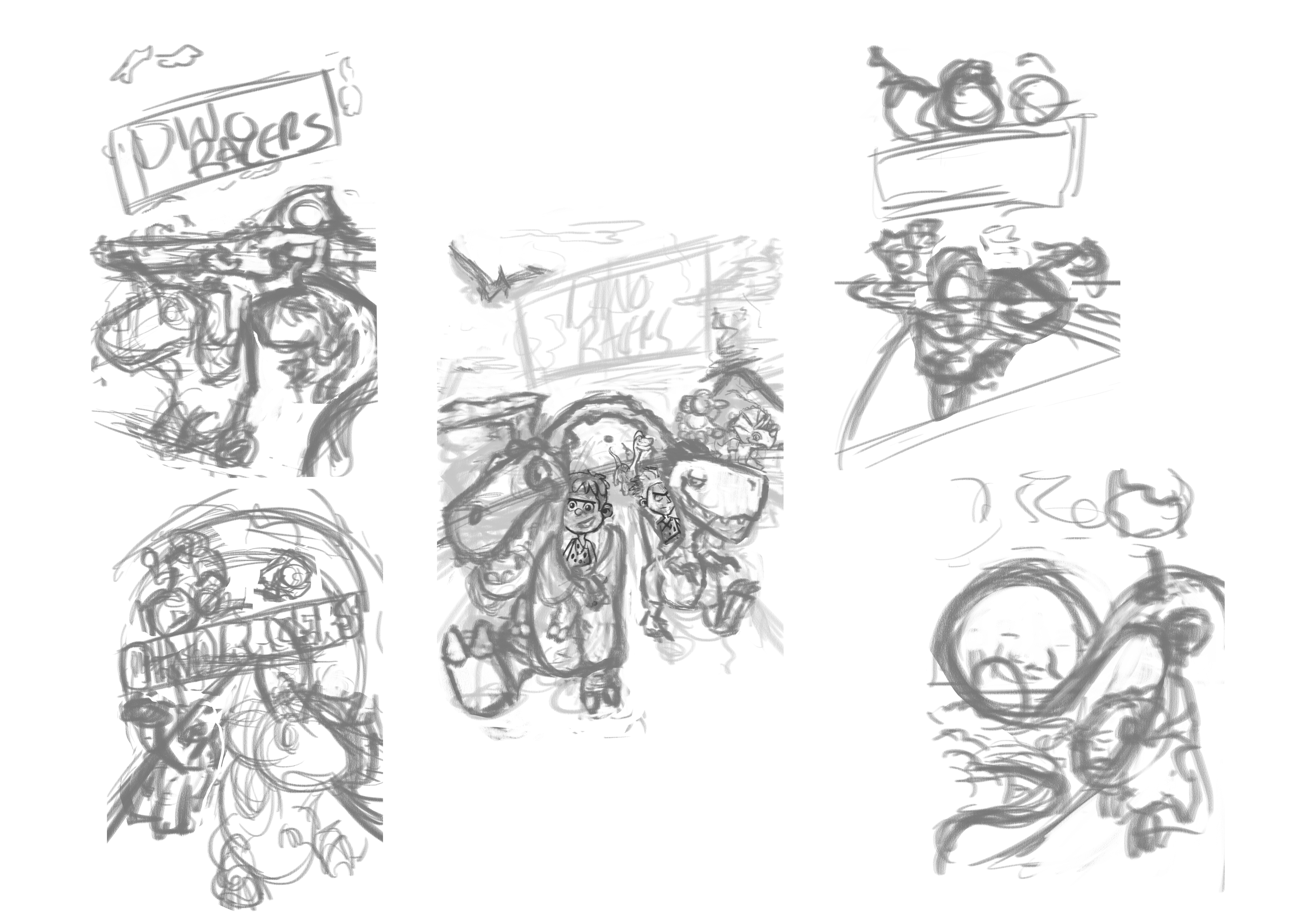 After finalising my designs I went to sketching the mock-up. I originally wanted the design to be a video game poster. That's why I designed 4 characters. It was going to be a game about dinosaur racing for kids.