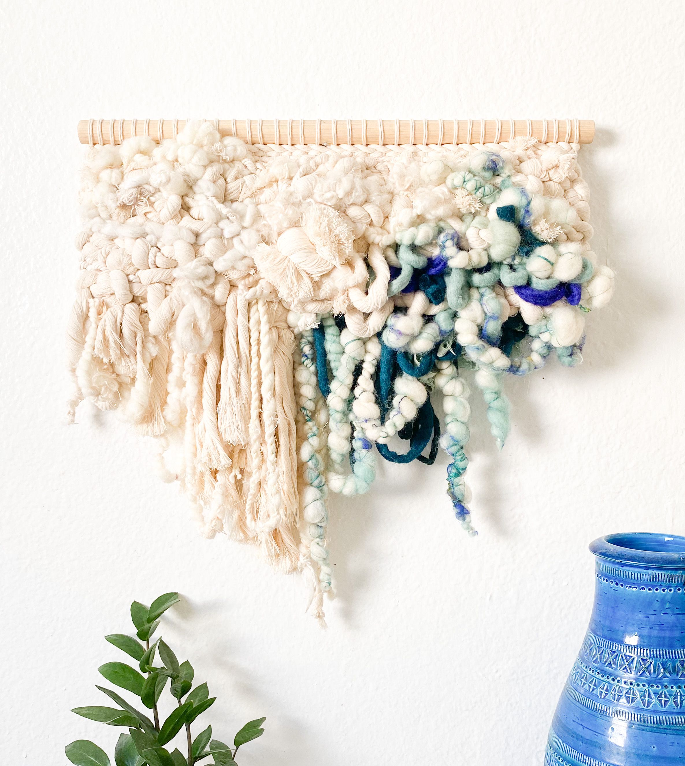 Handwoven on a custom loom as a personal project evoking ocean waves.