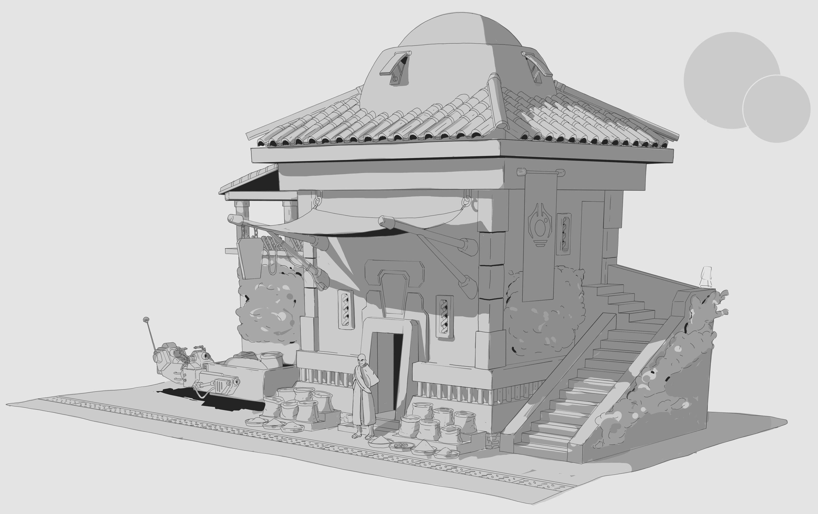 Preparatory sketch and final rendering in Photoshop. Building modeled in Blender.