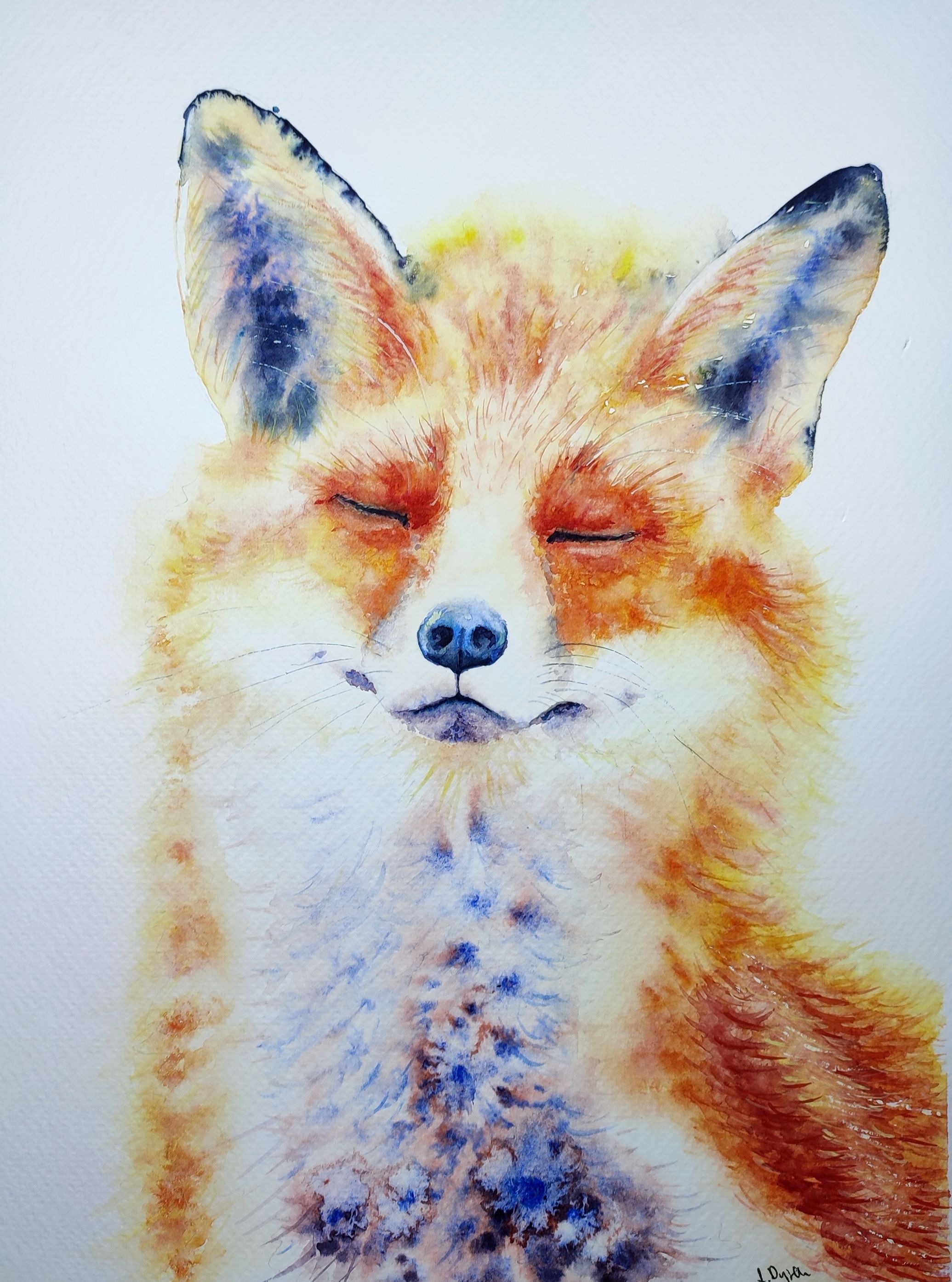 I painted this cheerful or sleeping fox because it seemed so optimistic and I could use the techniques I learned in the course - for example, blended edges, mixing colors.