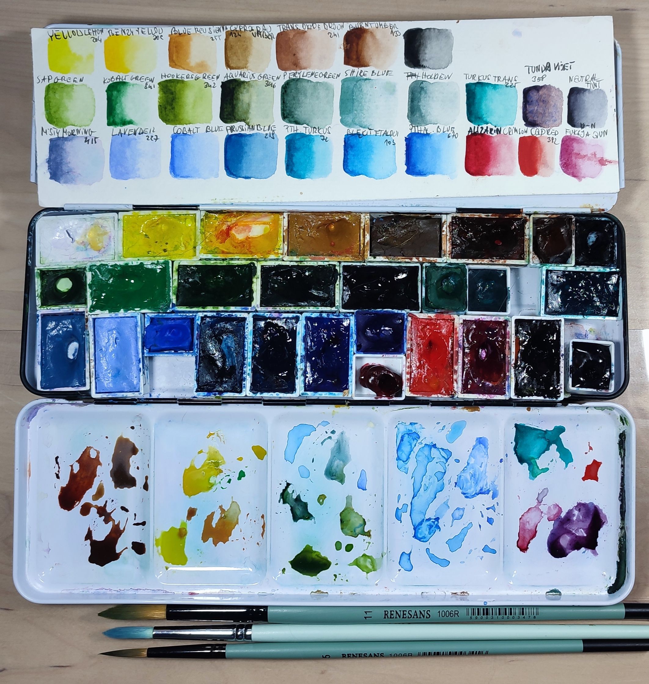 When painting, I used round brushes from the Renesans company, no. 5, 4 and 11. I used mostly watercolors from the Roman Szmal company.