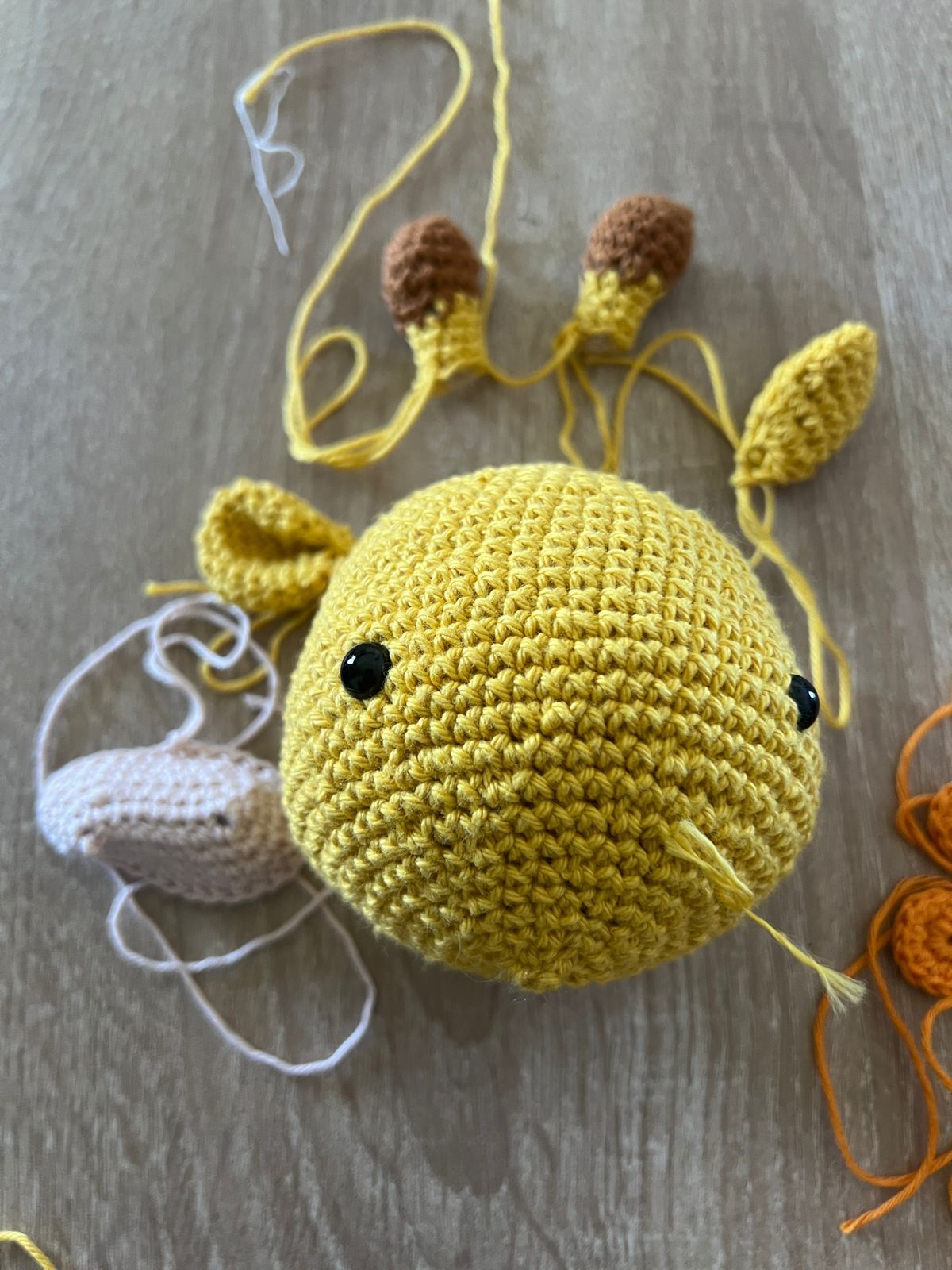 Hilo Cotton, Revesderecho: amarillo, galleta, beige, negro, naranja. Relleno, ojos de 8 mm. crochet 2.5 mm. contador de filas, marcador de filas, aguja, alfileres y tijeras.