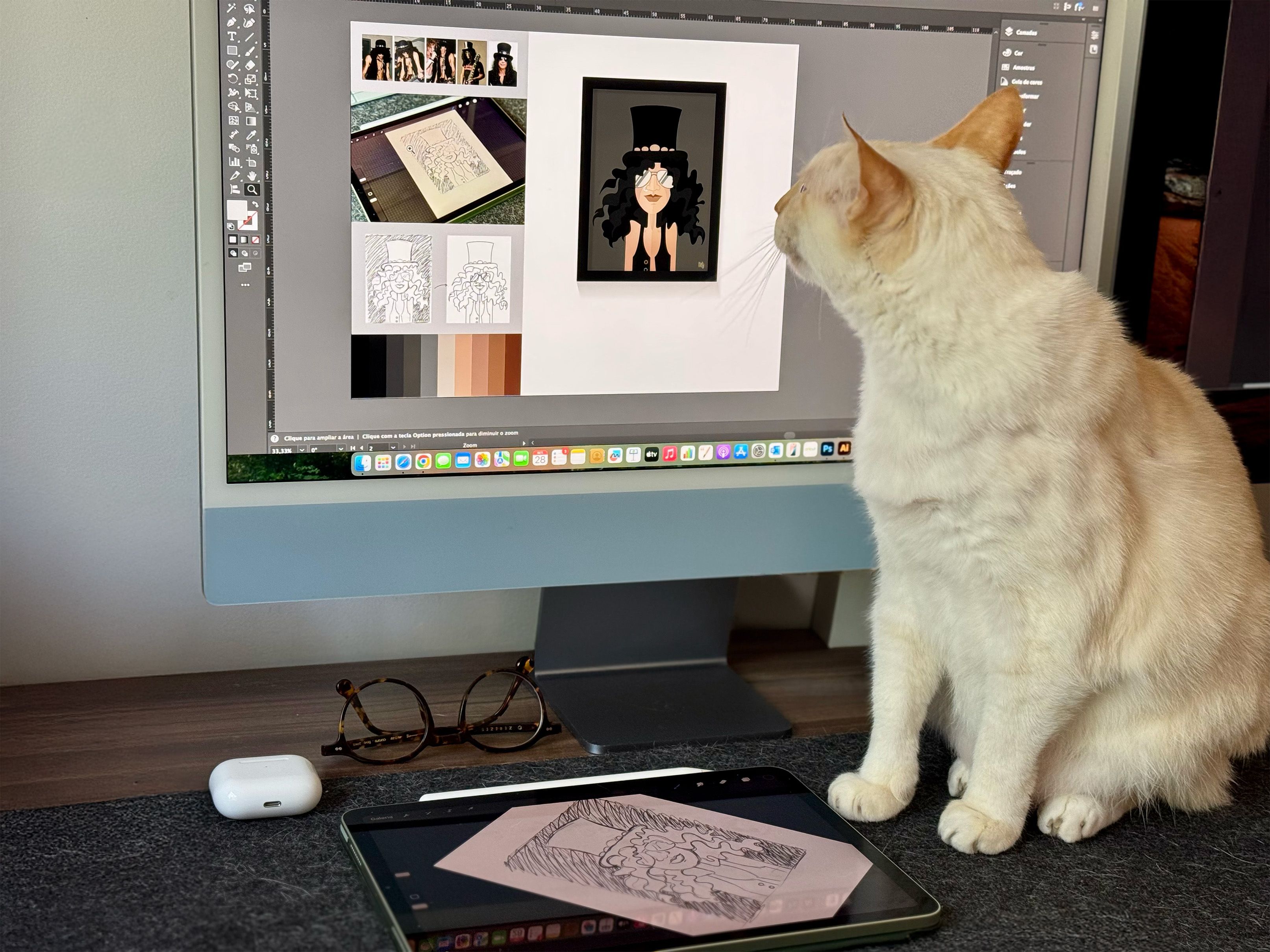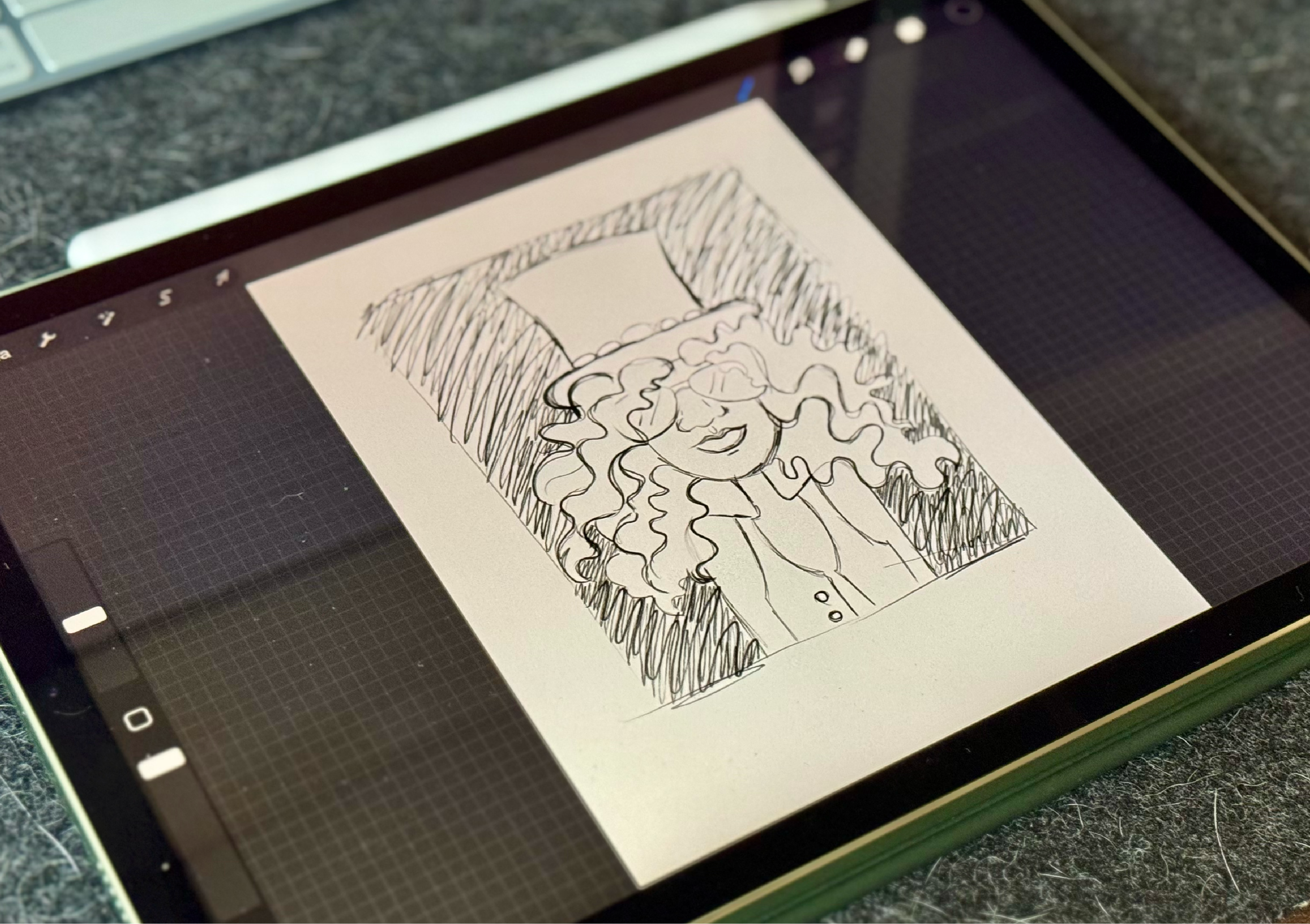 No Procreate, criei um esboço fluido e solto, focando nas formas principais e na silhueta marcante.